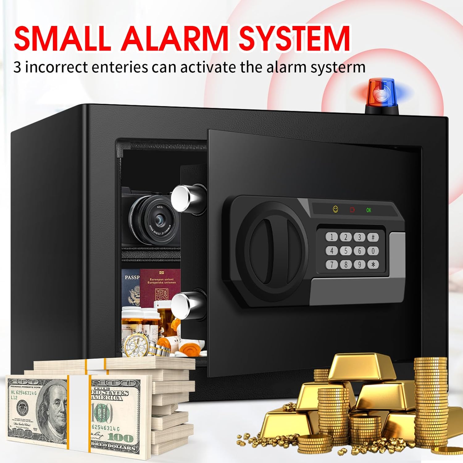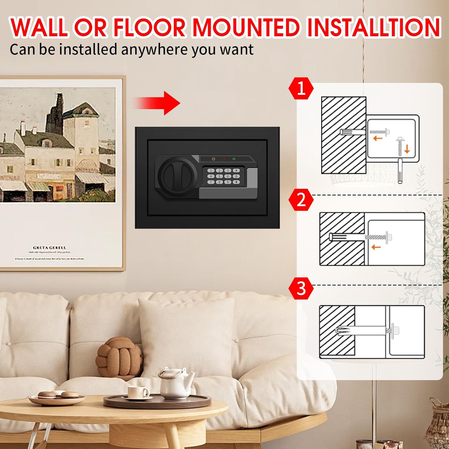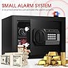 ANTI-THEFT ALARM & ANCHORING DESIGN: Our home safe comes with a dual alarm system to prevent password guessing and effectively deter unauthorized access. Enter the wrong password 3 times in a row will activate the alarm system and the safe will lock for 20 seconds. Anchoring design makes you easily fix the safe to the wall or floor, improving safety and reliability