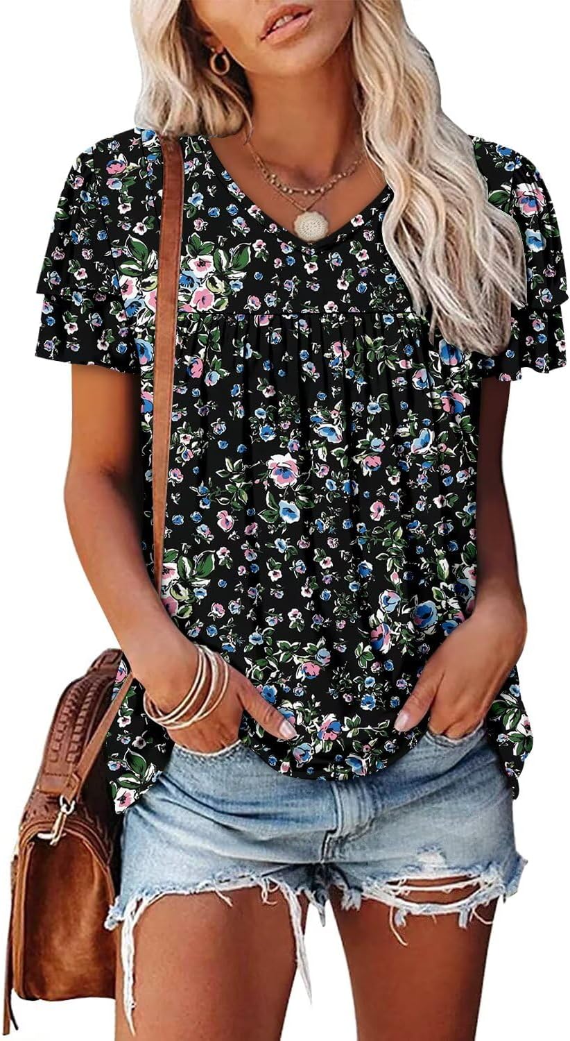 Magritta Womens Summer Tops Dressy Casual V Neck T Shirts Pleated Front Ruffle Short Sleeve Blouses Loose Fit Tunic Tops