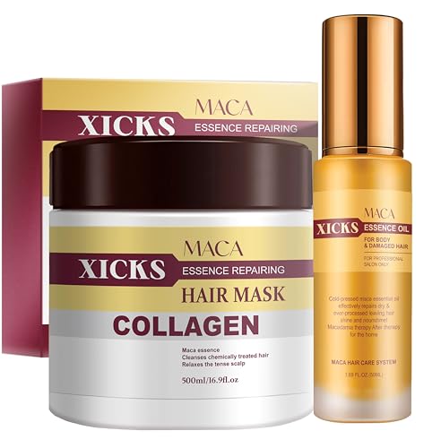 Maca Collagen Essence Repairing Hair Mask(16.9 oz) & Maca Essence Oil Set (1.69 oz)- Deep Conditioning Treatment for Damaged, Dry Hair - Restores Shine, Add Strength & Elasticity