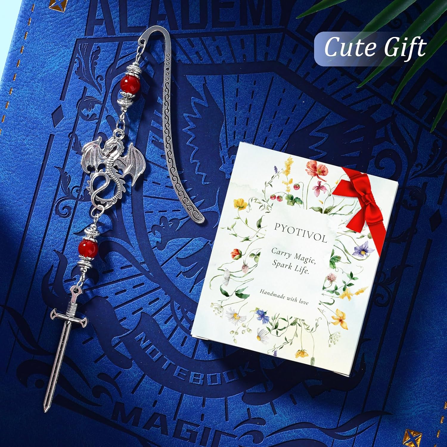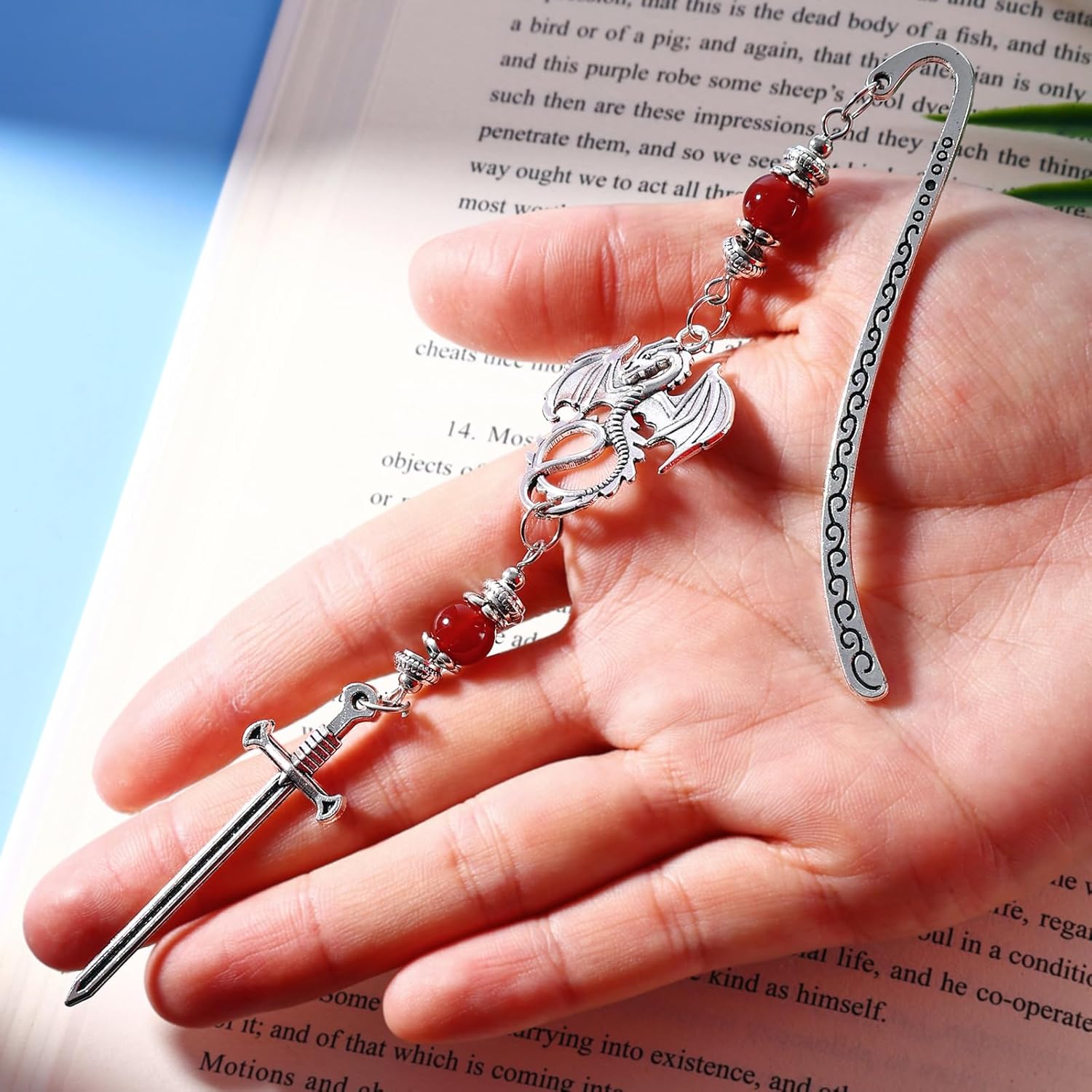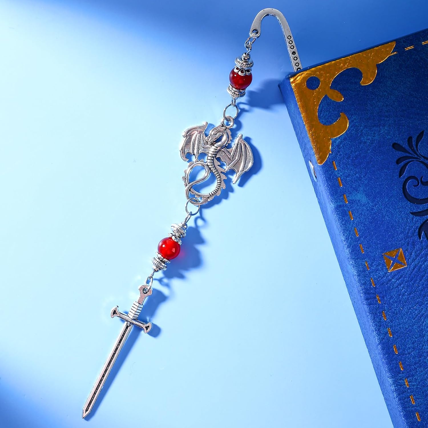 Vintage Bookmark Dagger Sword Pendant Silver Metal Hook Book Mark with Dragon and Glass Bead Chain -Fantasy Book Marks for Reading Women, Men, Book Lovers, Girls and Teachers Bookmarks