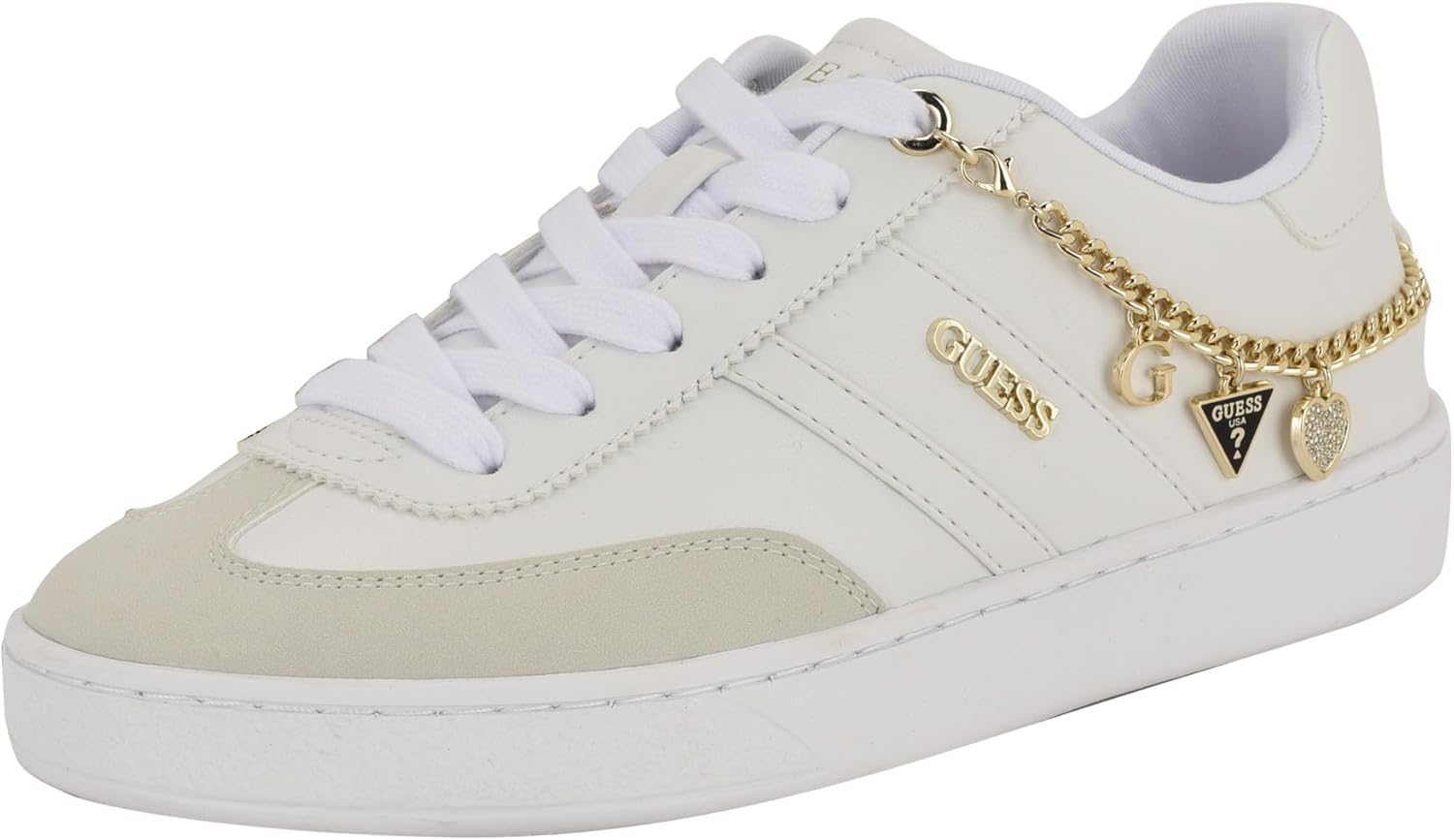 Add a charming touch to your athleisure look wearing the Guess Naoko sneaker. A class T Toe design gets a trendy update with a gold chain featuring adorable Guess charms. Est. 1981, Guess is a global lifestyle brand and a symbol of a young, adventurous lifestyle.
