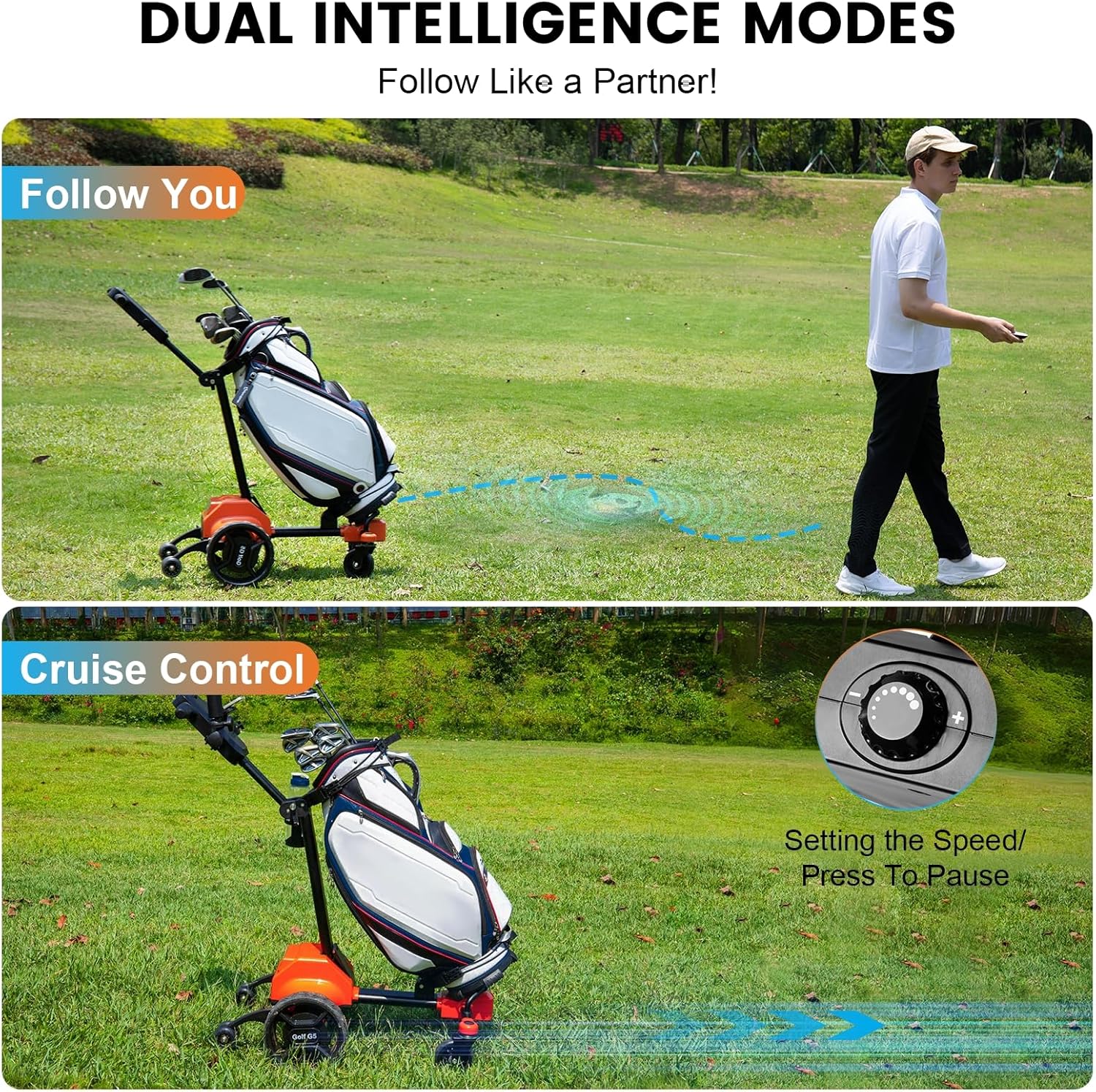 G5 Electric Golf Cart, Electric Golf Caddy That Follows You, Anti-Tipping, 45H Battery, All-Terrain (Remote/APP/Manual Control), Folding Design, Black+Orange