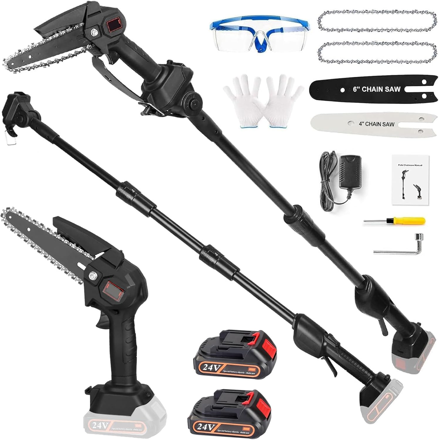 [ADVANCED CORDLESS POLE SAW & MINI CHAINSAW COMBINATION] - The newest upgraded TeqHome cordless pole saw is equipped with a 6-inch & 4-inch chain bar. To make it more convenient for customers to use, we have a new upgrade to the mini chainsaw, adding an automatic telescopic pole (according to the actual situation, it can be installed and used at will) for easy pruning of tree branches. Electric pole saws make tough jobs safer by giving you extra reach, without needing to depend on unstable ladders.