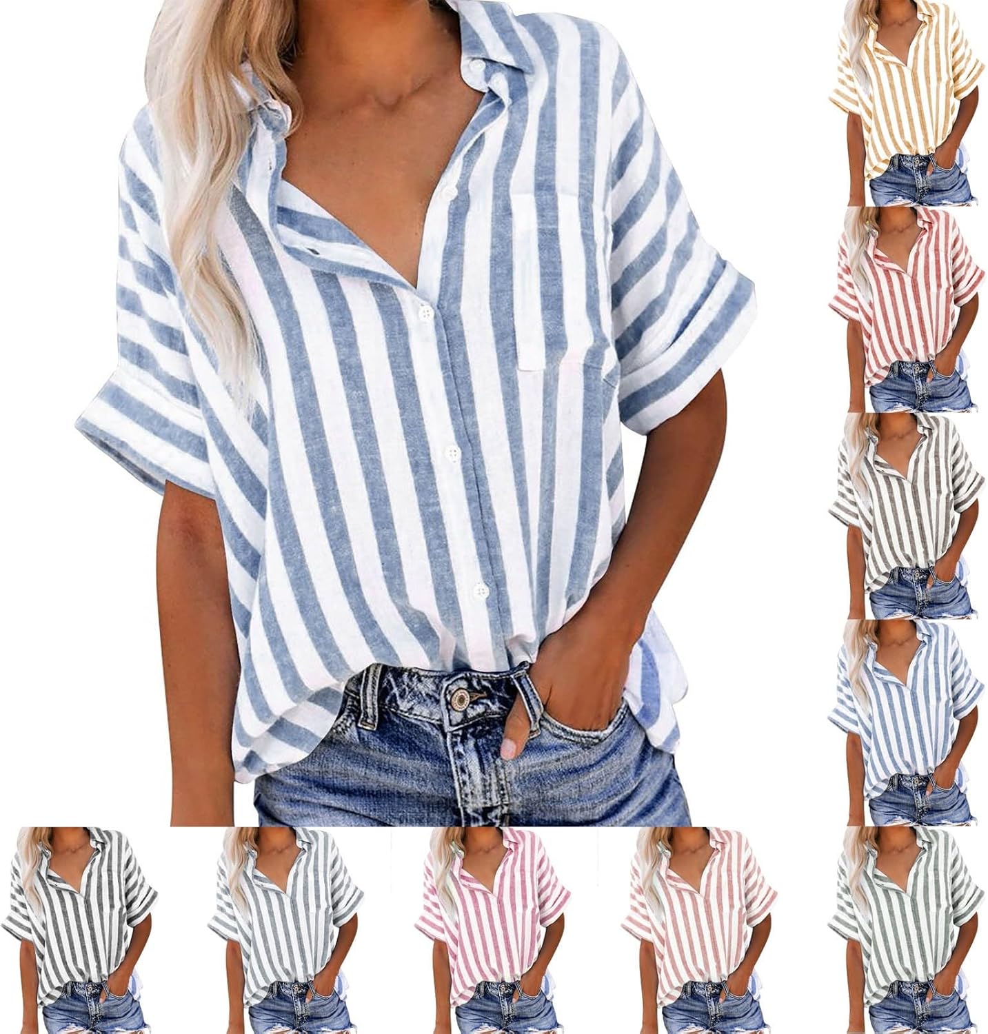 Striped Button Down Shirt Women Plus Size Business Casual Summer Short Sleeve Tops Cotton Linen Fitted Work Shirts