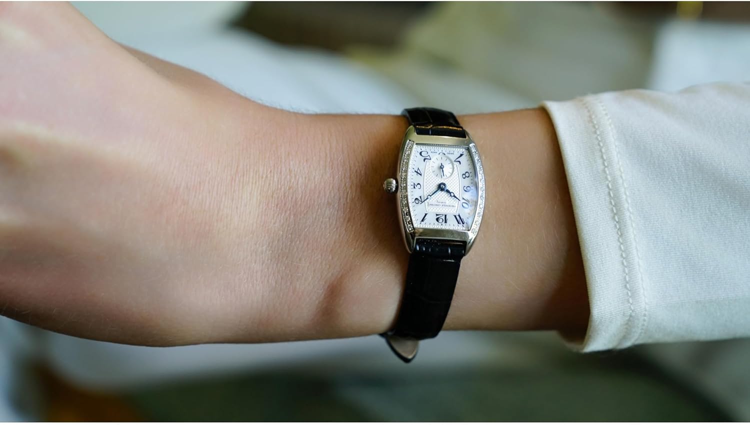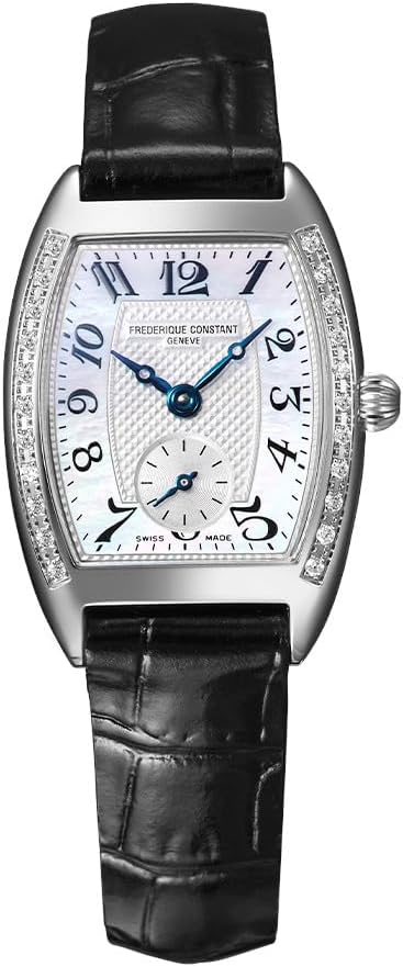 The Frederique Constant Classics Art Déco Tonneau, a highly desired case style during the 1940's that is now re-imagined with updated style and flair that compliments the feminine wrist during the day while maintaining an elegant look for evening. This 31x22mm stainless steel watch with 22 hand set diamonds along the case sides features a mother-of-pearl dial and small seconds, Arabic numerals and comes on a crocodile embossed black calf strap.