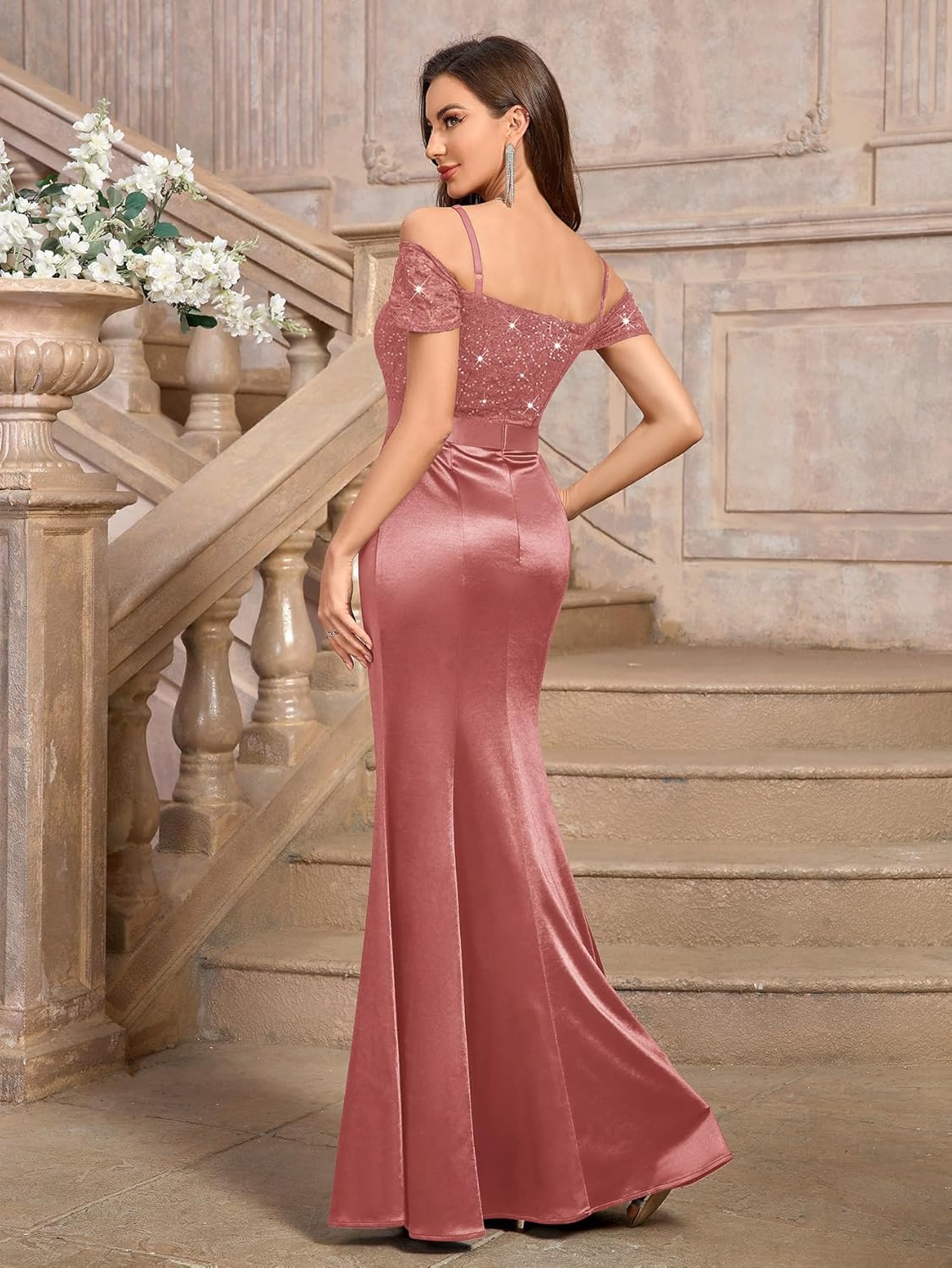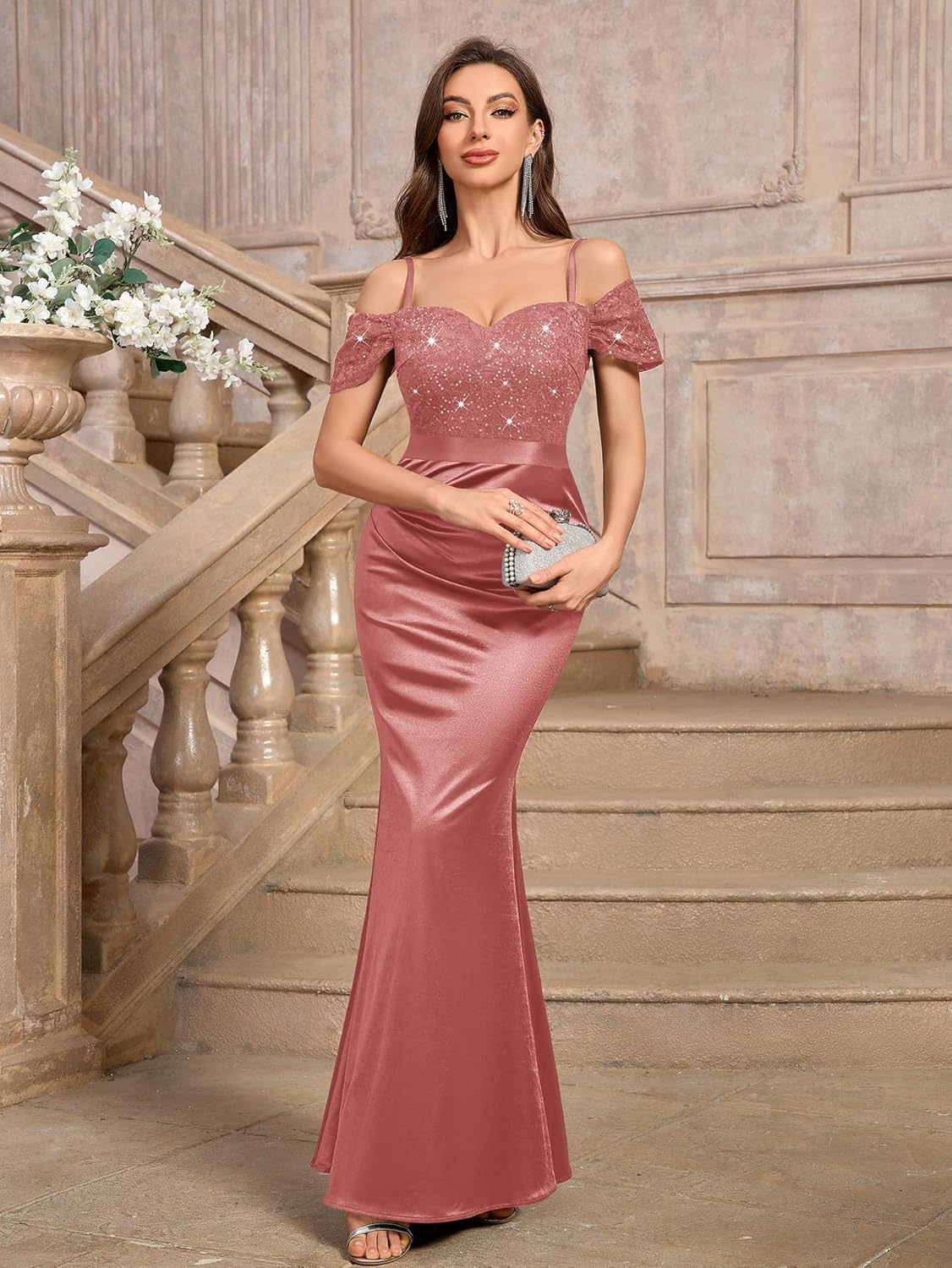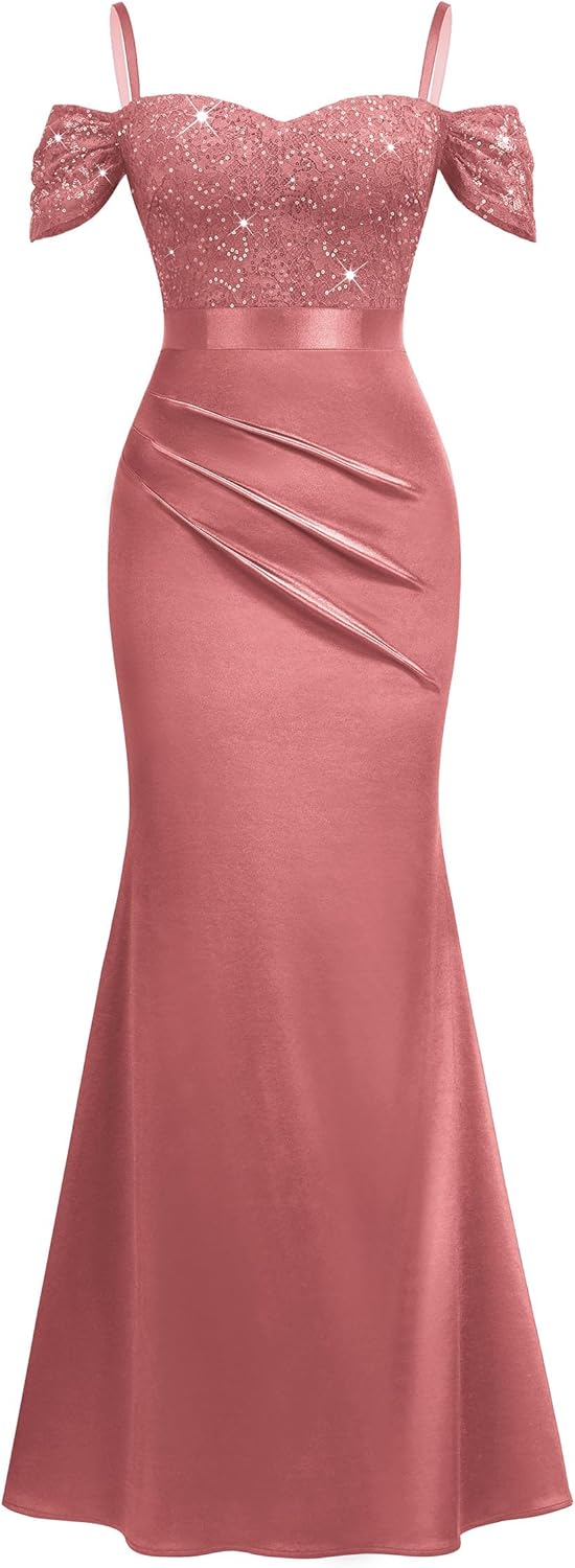 Miusol Women's Elegant Sequin Lace Spaghetti Straps Formal Satin Maxi Dress