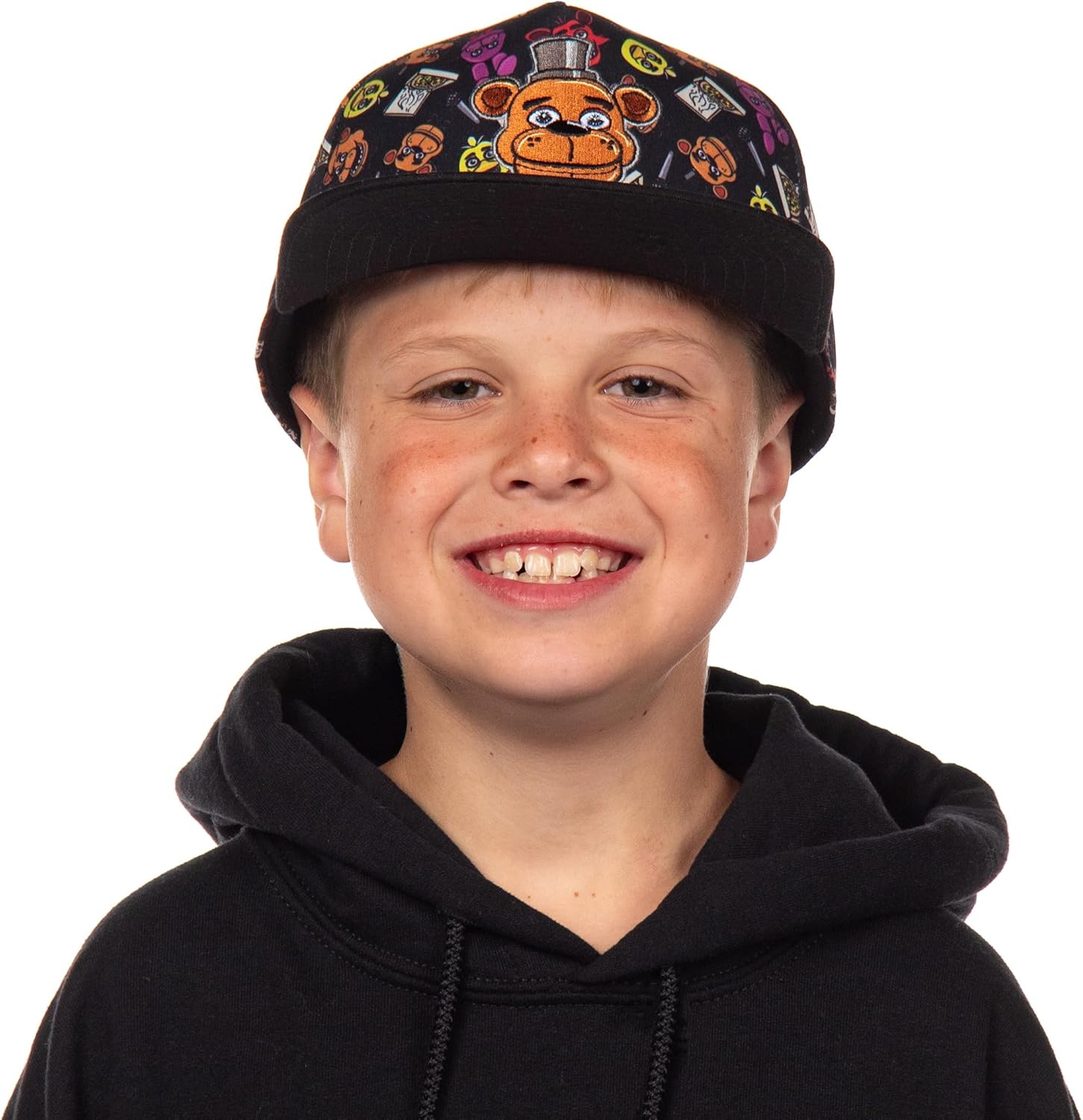 Let your Five Nights at Freddy’s fan bring the frights (and fun) wherever they go with this youth-sized snapback baseball cap featuring all their favorite characters. Freddy, Chica, Bonnie, Foxy, and more come to life in a vibrant all-over print, while the embroidered front panel art adds extra texture and character appeal. With its flat-bill design and adjustable snapback closure, this youth baseball hat delivers both style and comfort, making it an easy addition to their everyday wardrobe. Designed for fans who love bold character gear, this boys’ cap combines playful design with practical features that make it ready for school days, gaming sessions, or weekends out with friends. Lightweight polyester fabric keeps it comfortable, while the structured 6-panel build and breathable eyelet vents ensure a great fit that lasts. Whether they’re a long-time fan or just discovering the Five Nights at Freddy’s world, this adjustable snapback cap is a fun and functional way to celebrate the characters they love.