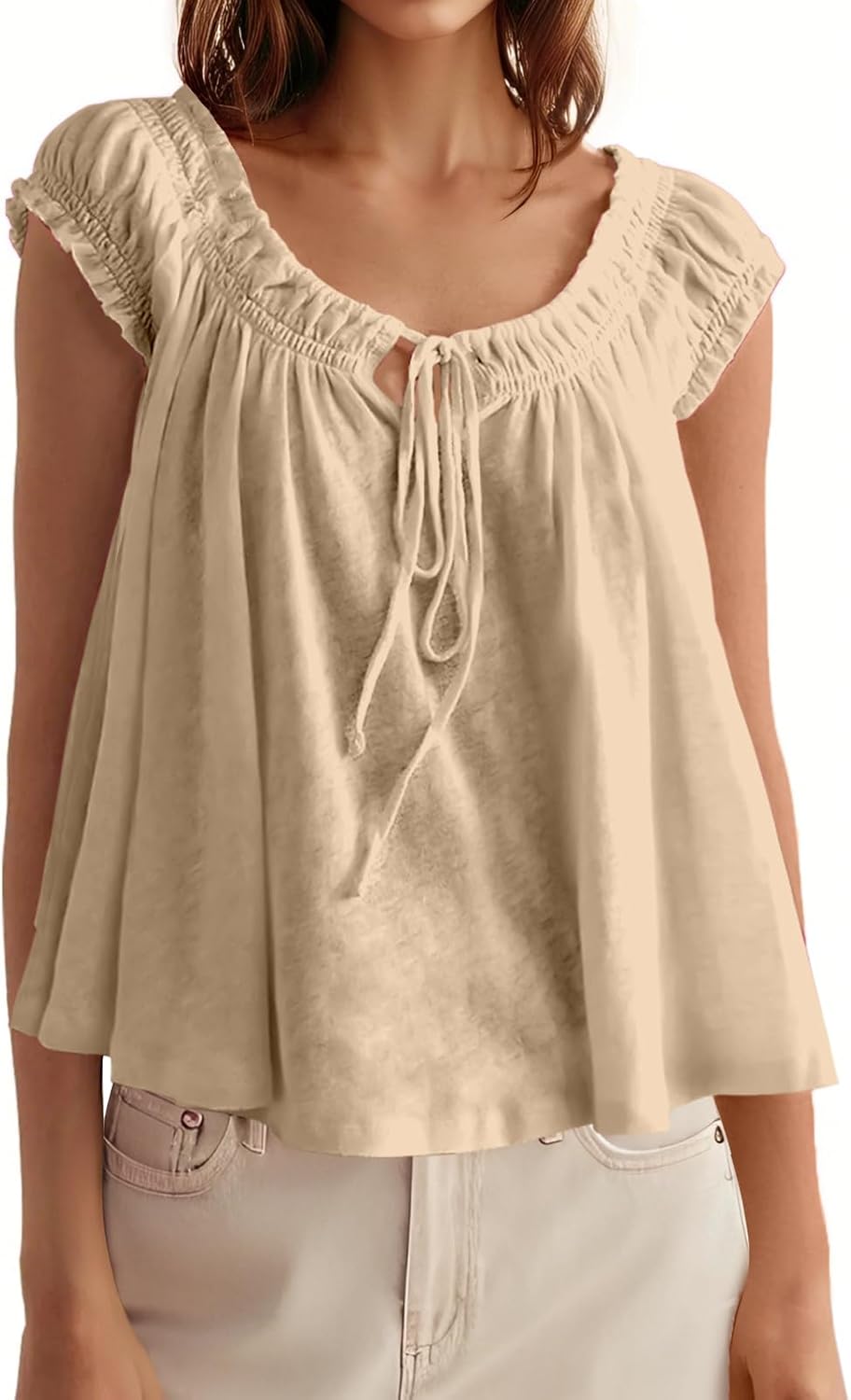 Tankaneo Women Summer Tie Front Tank Tops Cap Sleeve Pleated Babydoll Tops Casual Loose Fit Going Out Flowy Shirt