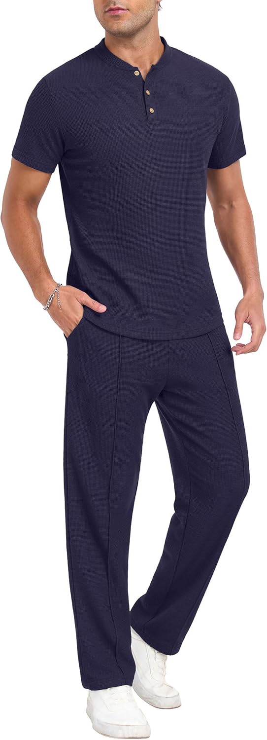 PrinStory Men's Short Sleeve Outfits Waffle Knit Henley Shirt and Pants Set Casual 2 Pieces Summer Tracksuits with Pockets