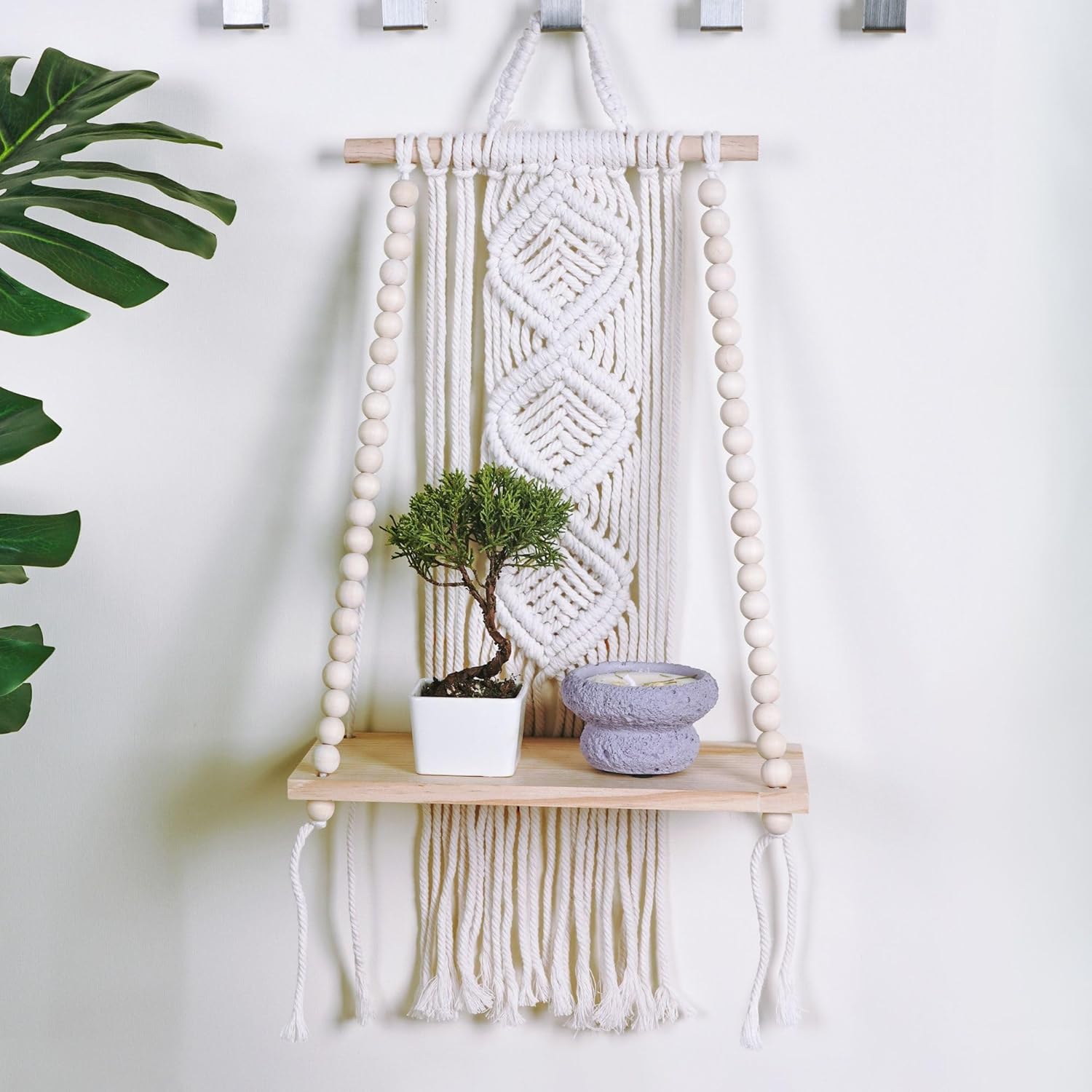 Handmade Boho Charm: Elevate your space with this hanging boho wall decor, designed with intricate macrame knots, wooden beads, and a sturdy wood shelf; a perfect blend of function and beauty, our modern wall art adds charm to any space