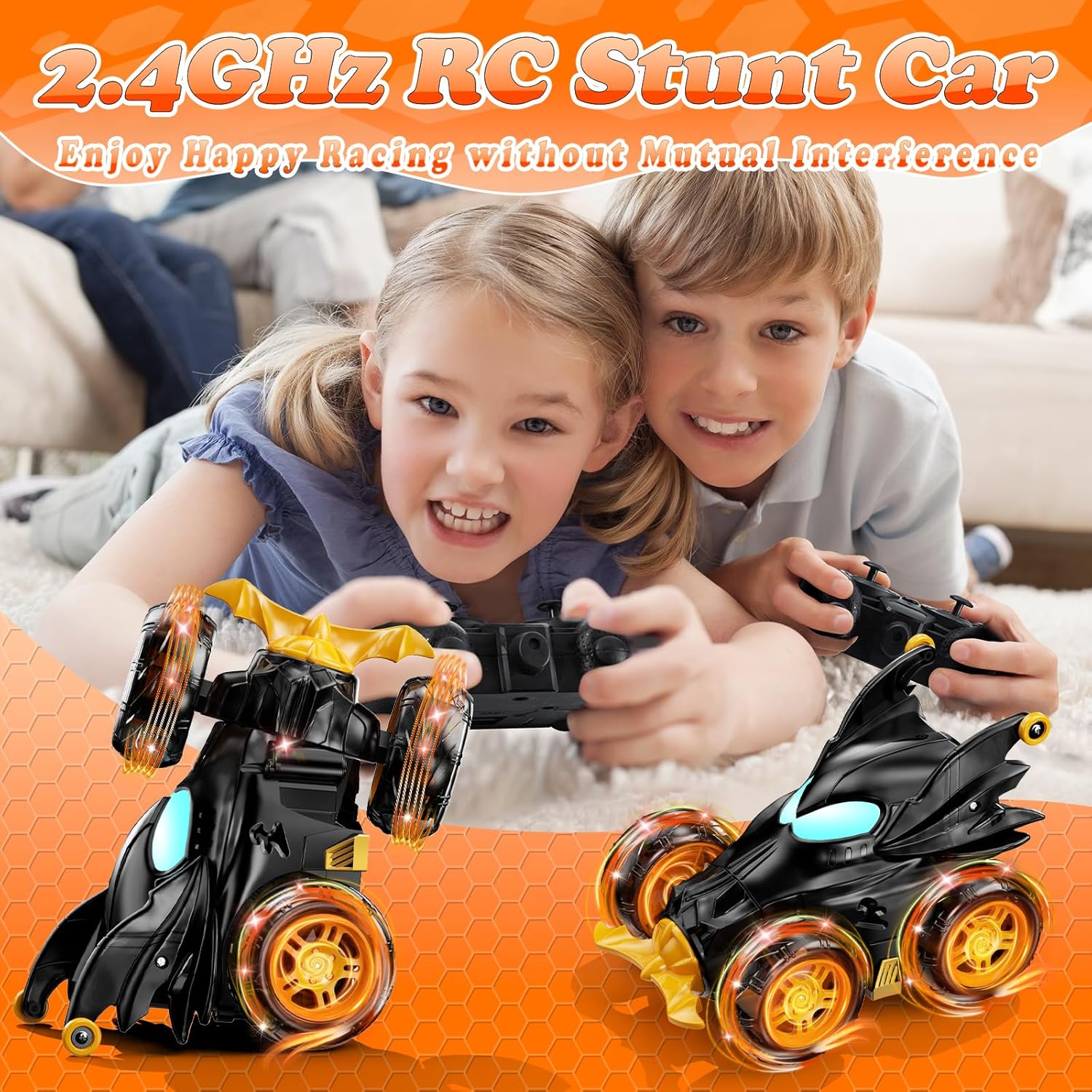 Fun Stunt & Attractive Light: Our RC cars can make cool stunts, 360 degree rotation flip and 90 degree upright driving, forward and backward, cool bat design and cool lighting effects make your kids can be the center of attention in a crowd.