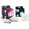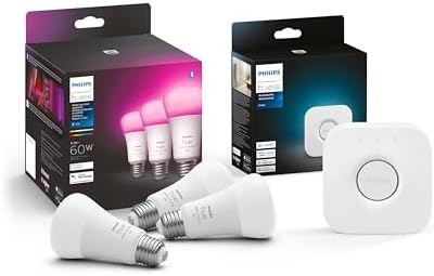 Philips Hue Smart Lighting Bundle: 3-Pack A19 LED Smart Light Bulbs (White and Color Ambiance) with Philips Hue Bridge - Control with Hue App, Compatible with Alexa, Google Assistant, Apple Homekit