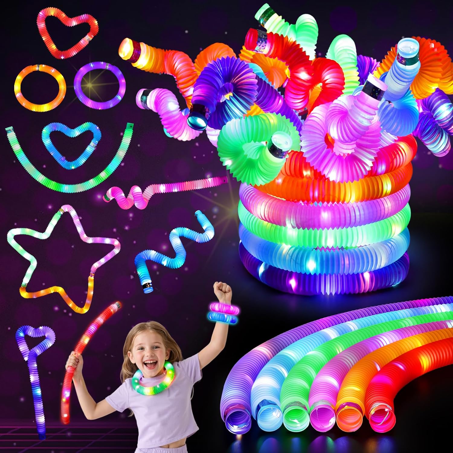 Large Number of Glow Sticks - Retractable Design: Perfect for kids' events, festivals, and parties, this set includes 24 glow sticks in 6 vibrant colors. Each pop tube features 14 bright LED bulbs with 3 lighting modes: fast flash, slow flash, and steady light, creating a captivating glow. When stretched, each tube extends to 25 inches, while its size is 7.5 x 1.2 inches before stretching
