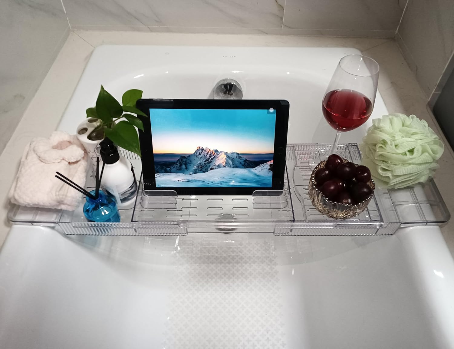 Adjustable Bathtub Tray - Transparent Acrylic Expandable Bath Shelf, Spa Caddy Tray for Relaxing Reading, Wine Glass, Women Luxurious Bathtub Accessories