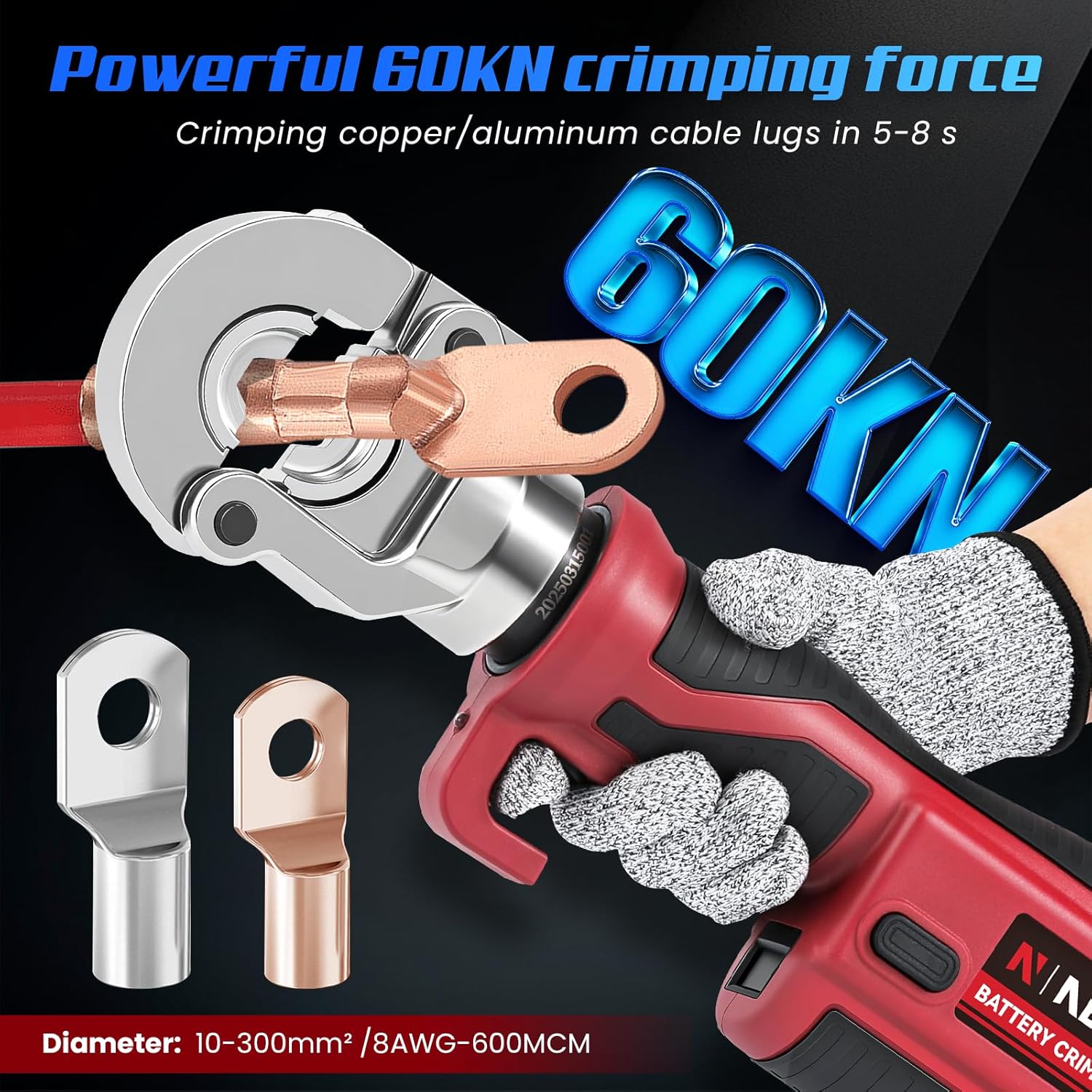 [Basic parameters]---Crimping force: 60KN/6 ton; Stroke: 33mm/1.3”; Crimping range: 10-300mm²/8AMG-600MCM; Crimping times: 120 times; Crimping cycle: 5-8s (depend on the size of the cable); Voltage: 21V; Battery capacity: 5000mAh; 2 pcs; Charger: 1; Charging time: 2 hours; Dies: 12 pcs; including 10, 16, 25, 35, 50, 70, 95, 120, 150, 185, 240, 300mm²; Weight of the whole set: 21lb