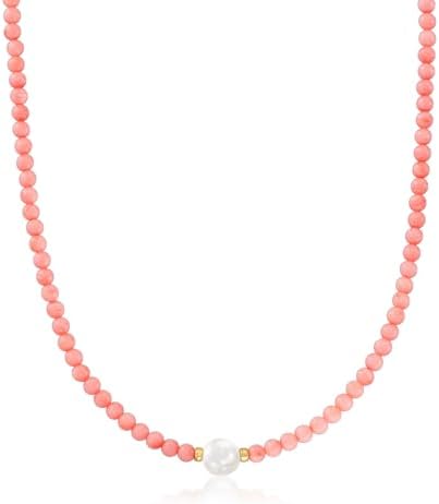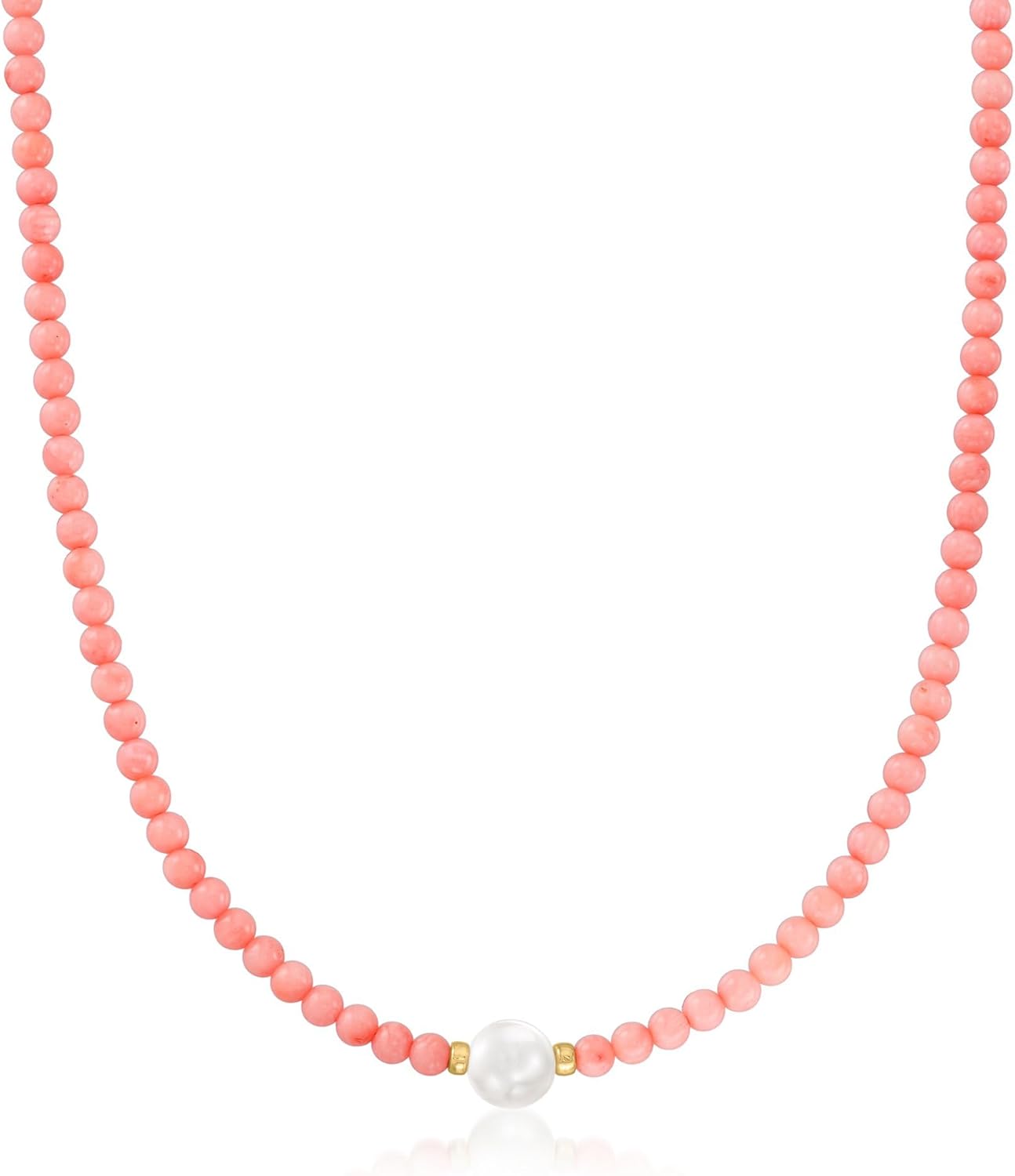 Ross-Simons 8.5-9mm Cultured Pearl and 4mm Pink Coral Bead Necklace With 18kt Gold Over Sterling