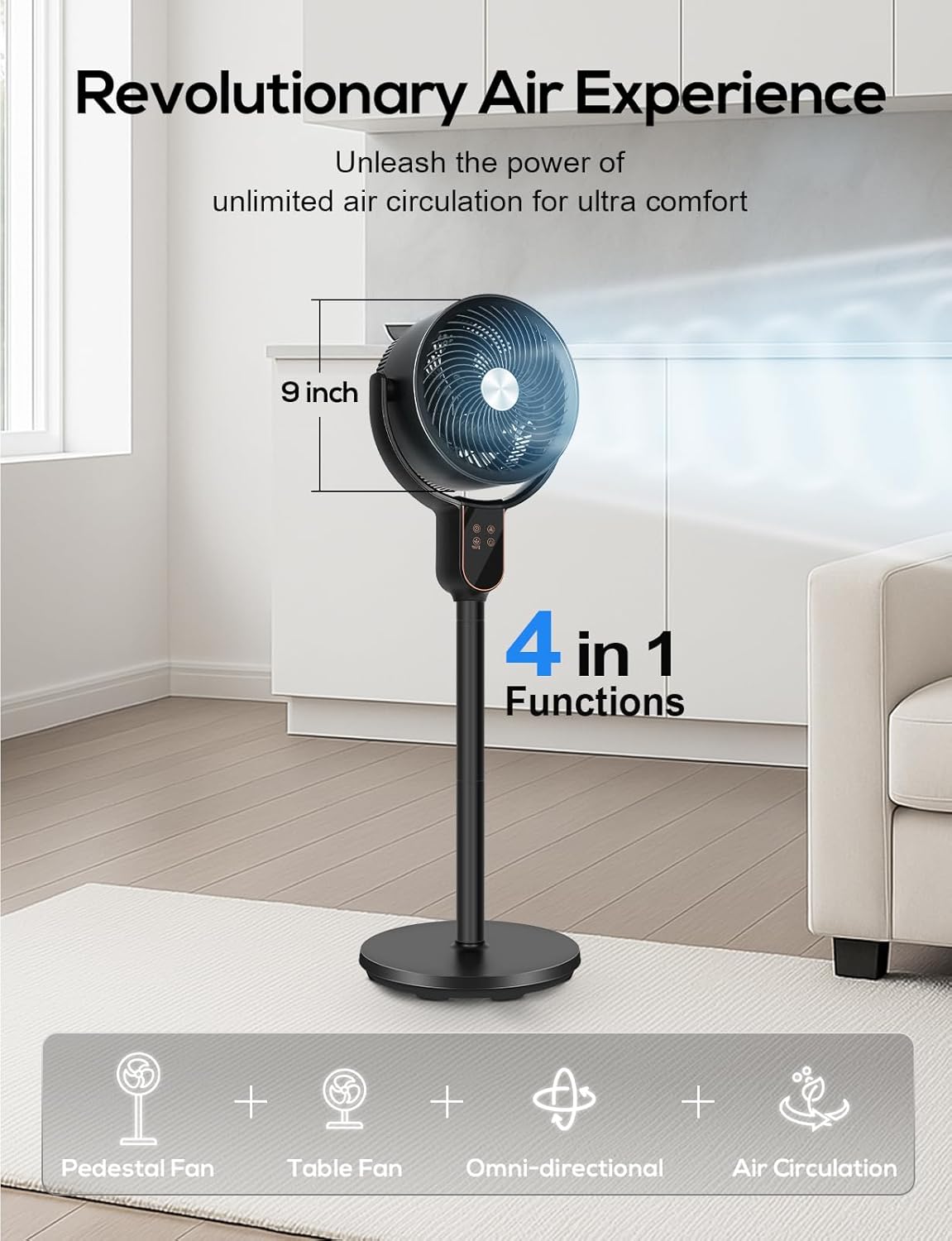 Omnidirectional Oscillating -- 70°and 90°omnidirectional oscillating to meet the multi-directional air supply needs of the room. In summer, oscillating standing fan is used in conjunction with air conditioning to accelerate the diffusion of cold air; In winter, pedestal floor fan is used in conjunction with heating equipment to promote heating circulation. The mode can be switched with one click through the panel or remote control, meeting the needs for directional or wide-angle coverage