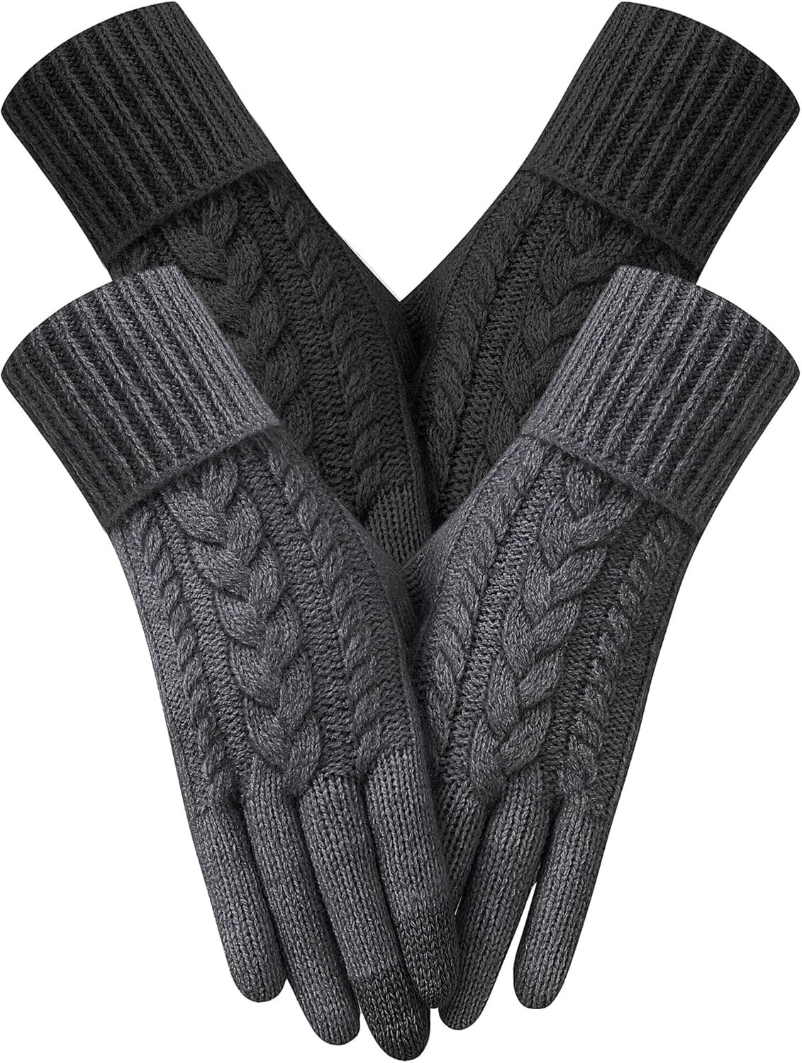 2 Pairs Winter Gloves for Women, Touch Screen Warm Knit Gloves for Cold Weather, Soft Fleece Lining for Hiking Driving
