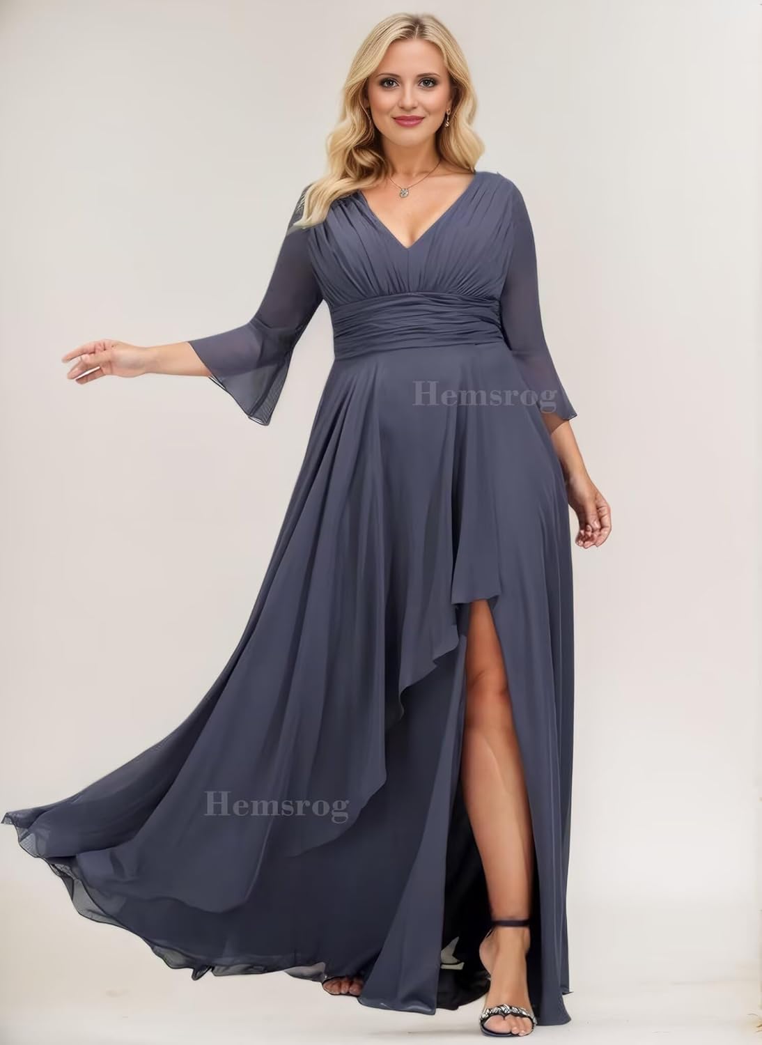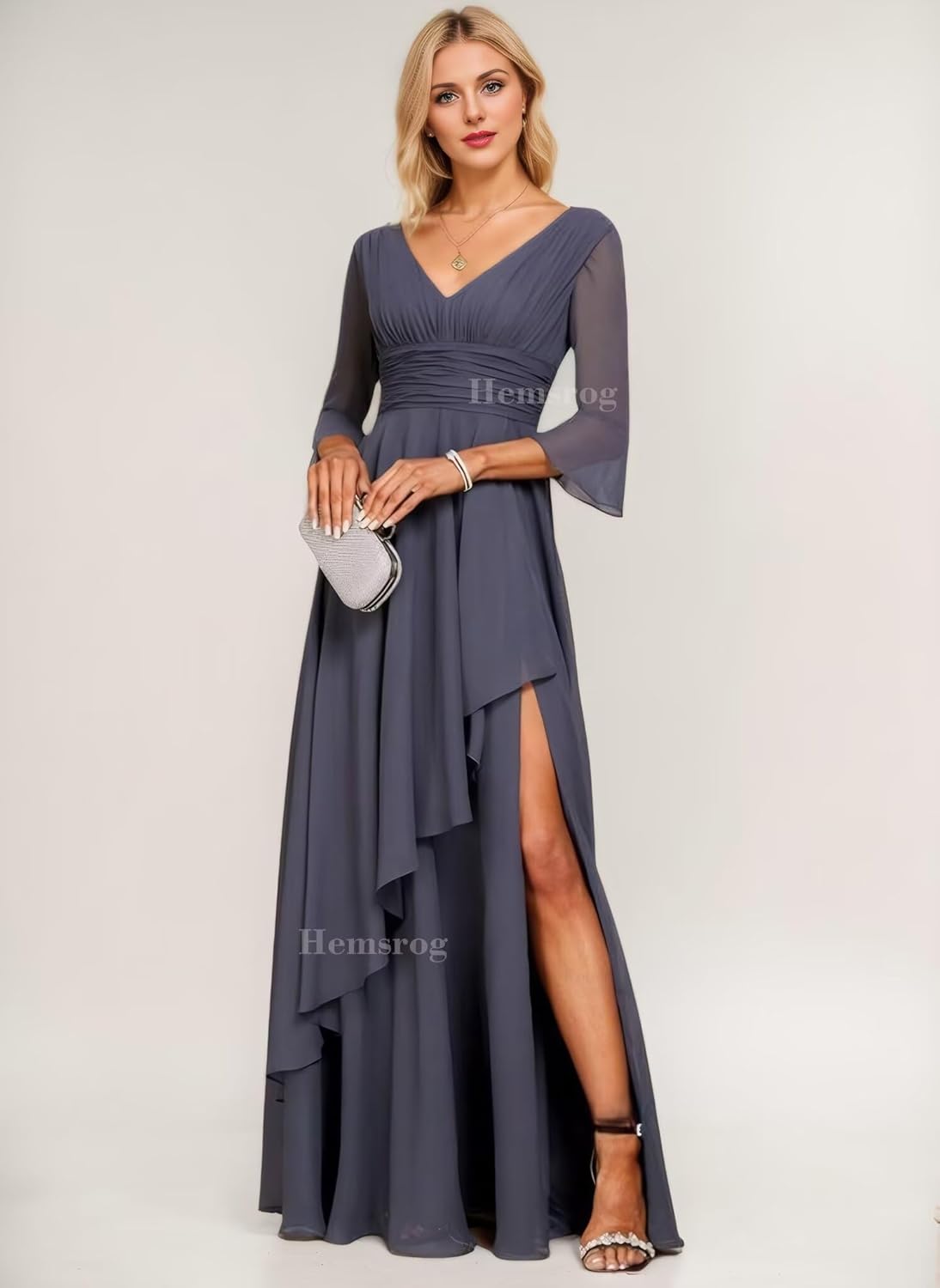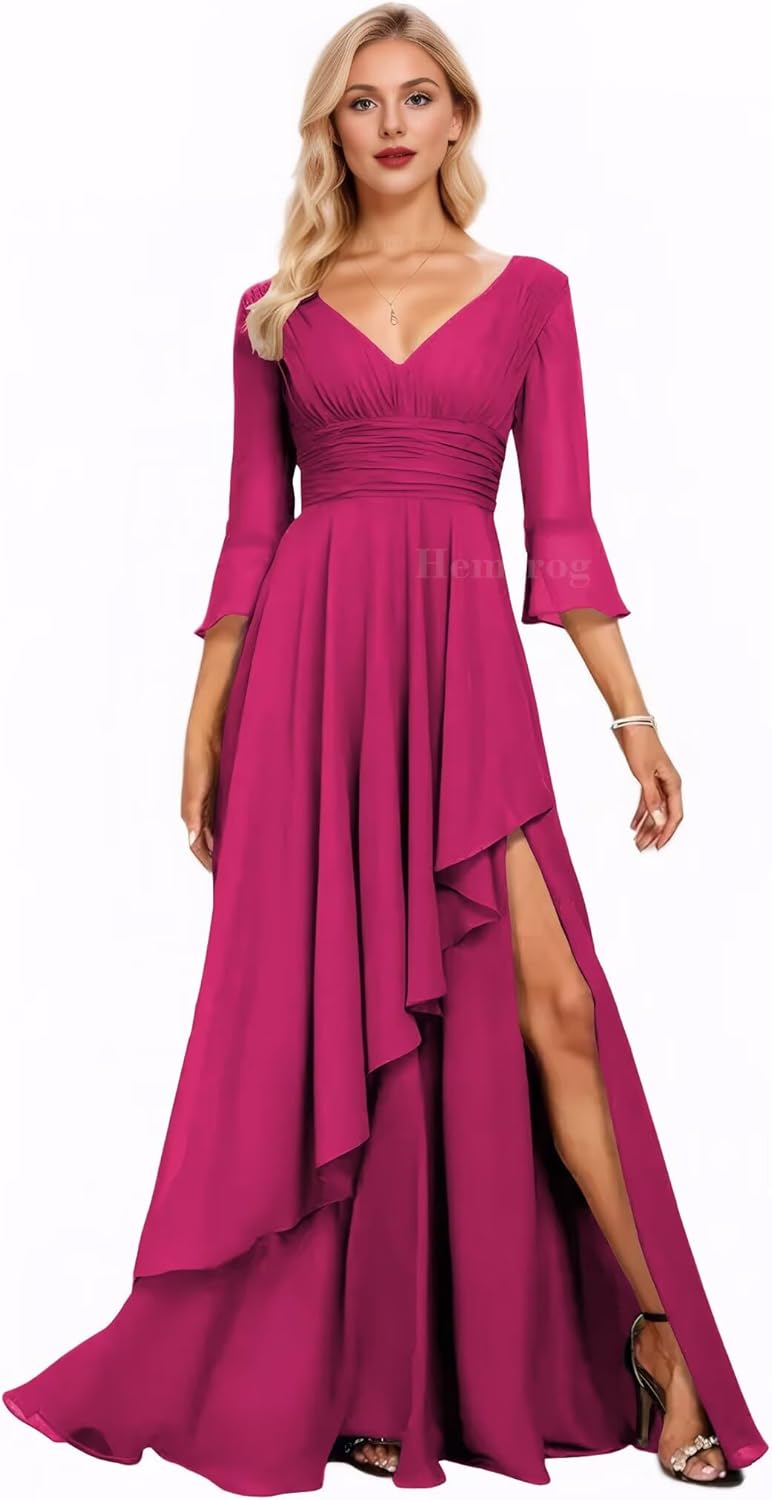 V Neck Mother of The Bride Dresses for Wedding Chiffon 3/4 Sleeve Bridesmaid Dress Long Formal Dress for Women with Slit