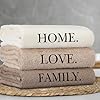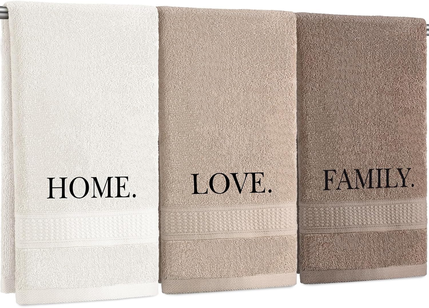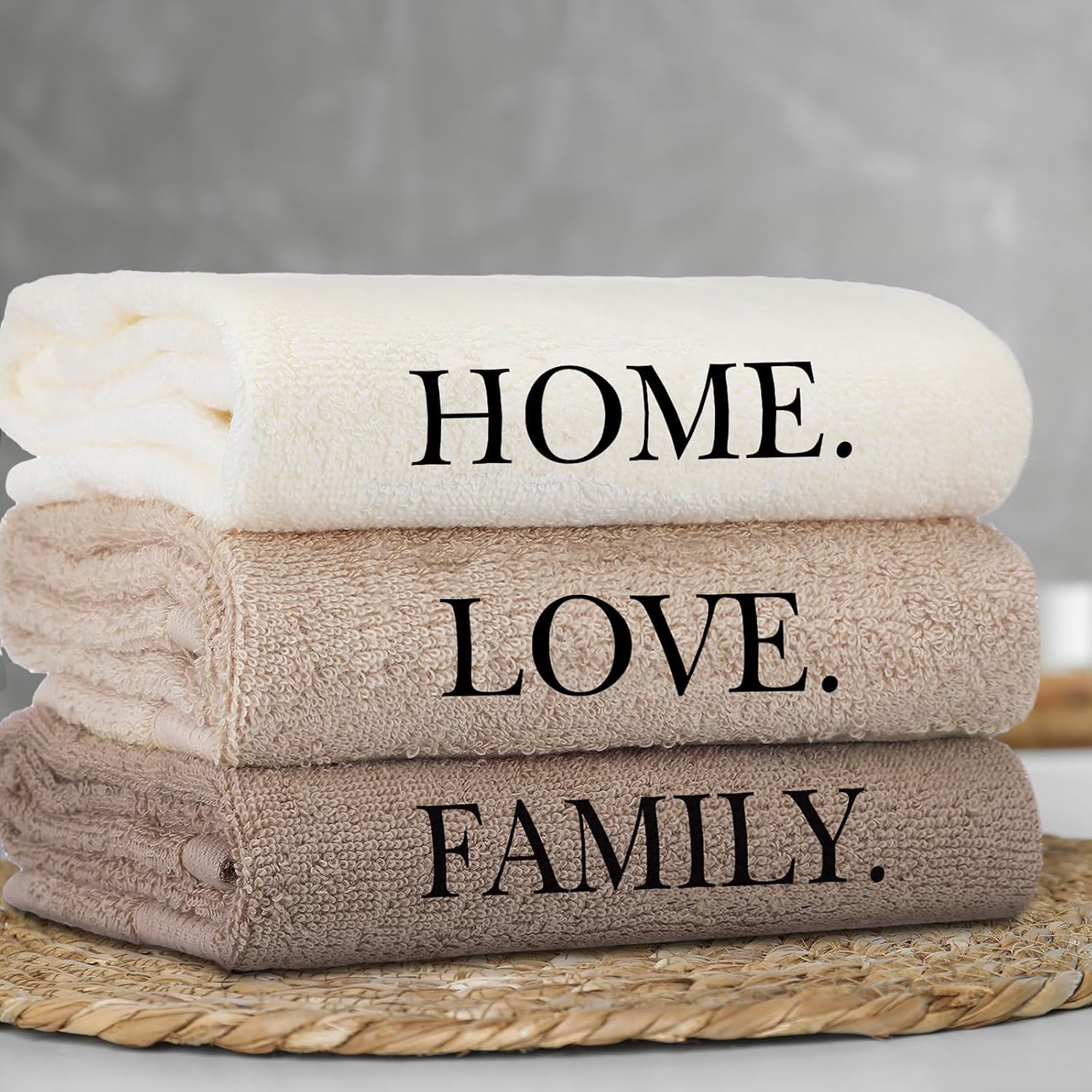 Embroidery Design: each hand towel's edge is cleverly adorned with heartwarming words: "Home, Love, and Family"; These words are delicately embroidered, showcasing refinement and beauty with every stitch, not only enhancing the towel's artistic appeal but also imparting a unique emotional value