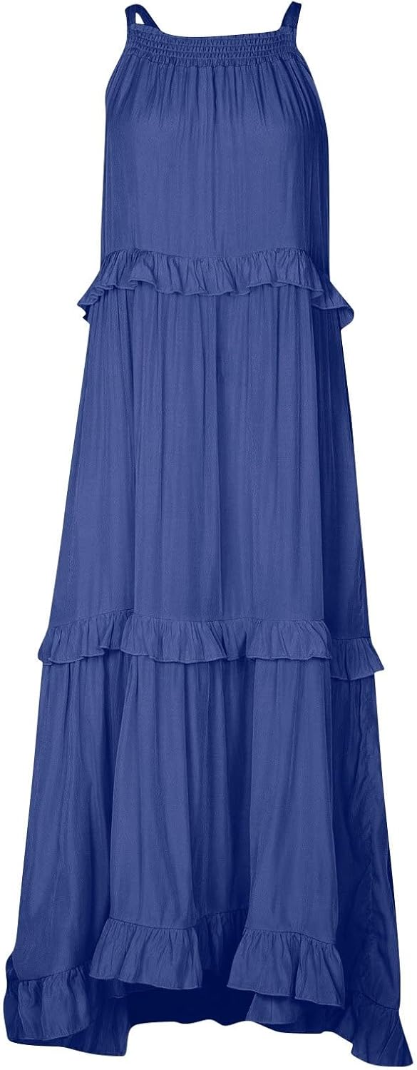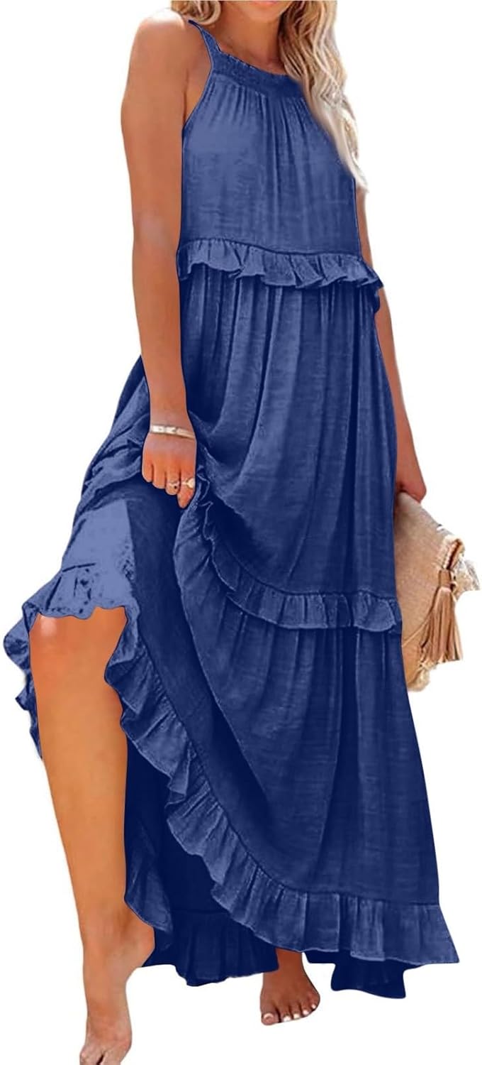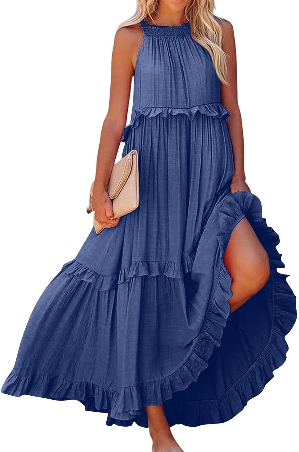Smocked Dress Women Summer Sleeveless Tank Dresses Halter Tie Back Flowy Ruffle Tiered Maxi Dress with Pockets