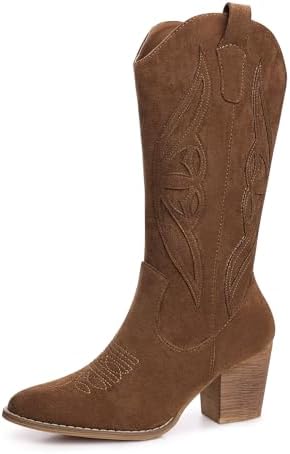 SHIBEVER Cowboy Boots for Women 2025: Mid Calf Cowgirl Boots Western Embroidered Country High Heel Pointed Toe Booties