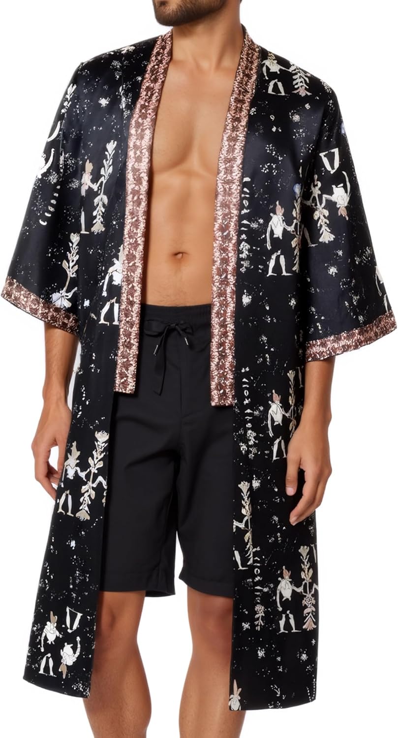 PRODESIGN Mens Satin Kimono Robe - Long Silky Sleepwear Nightgown Egyptian Bathrobe Dressing Gown Cardigan Beach Cover UpFeatures:Material: Polyester, silky and breathableSize: Five sizes available for you to choose from. You can refer to the size chart for more detailsDesign: Completed with durable french seam and decorated with Egyptian style pattern, this mens satin kimono cover up will add extra understated luxury to your daily lookFeatures: Long style up to knee, removable sash tie, belt loops, inside ties, short placket, side pockets, luxurious flowing drapeOccasion: This men’s kimono robe can be worn as bath robe, sleepwear, nightgown, swimsuit, cover up, beach wear, loungewear, also great for vocation, holiday, seaside, costume party and casual wear