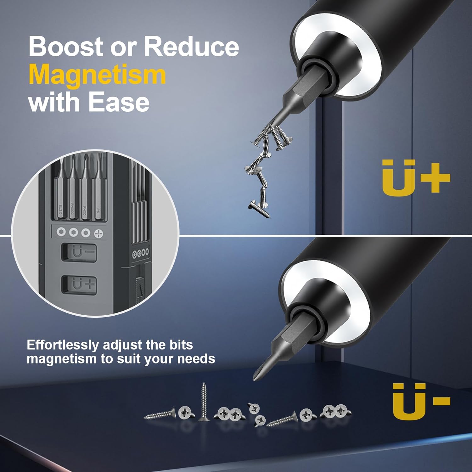Magnetic Storage for Bits:The small tool kit has Durable Aluminum Alloy & Push-Pop Bit Storage,Lightweight yet sturdy aluminum body ensures durability. The press-to-release bit holder allows quick and easy bit changes without fumbling.The mini drill set comes with a magnetic case that keeps the power screwdriver and 76 metal bits orderly in a place,preventing drops.The "click in" design makes it completely secure when tossing in a backpack, or carrying it from place to place.