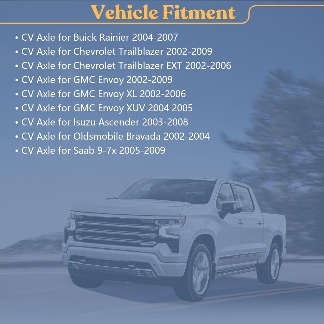 Vehicle Fitment: CV Axle Front Pair Driver and Passenger Side for GMC Envoy XUV 4.2L 5.3L 2004 2005, for GMC Envoy XL 4.2L 2002-2006, for GMC Envoy XL 5.3L 2003-2006, for GMC Envoy 4.2L 2002-2009, for GMC Envoy 5.3L 2005-2009, for Saab 9-7x 4.2L 5.3L 2005-2009, for Saab 9-7x 6.0L 2008 2009 Constant Velocity Drive Axle Halfshaft, CV Joints Half-Shaft, CV Shafts Drive Train Driveshaft Driving Shaft