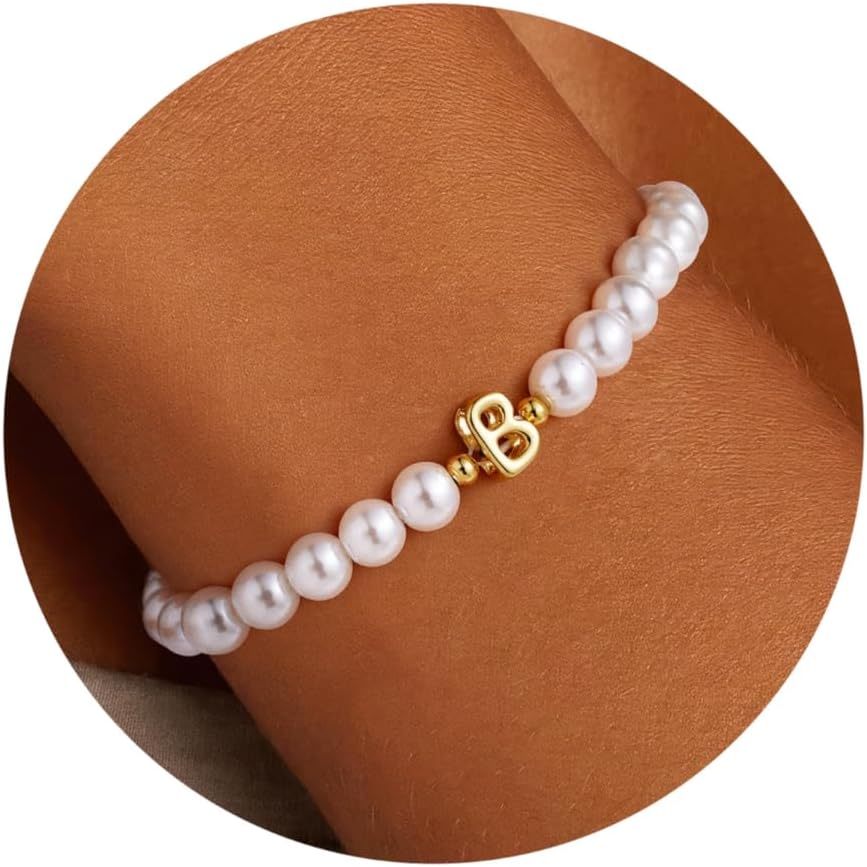 M MOOHAM Pearl Initial Bracelet for Women - Dainty Beaded Charm Bracelets for Women Trendy Charm Letter A-Z Personalized Pearl Jewelry Gifts