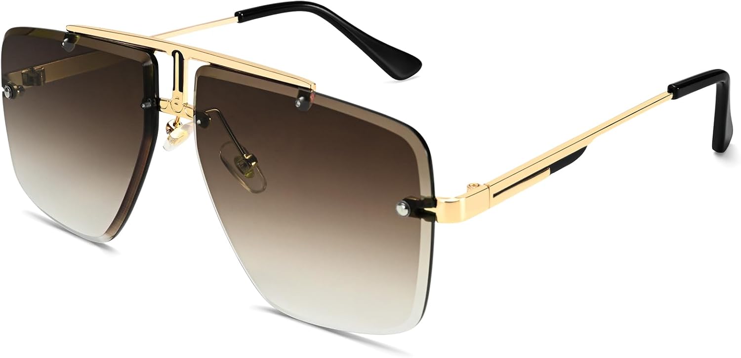 Rimless Oversized Square Sunglasses for Men Trendy Fashion Big Shades Tinted Lens Gold Metal Frameless Glasses UV400