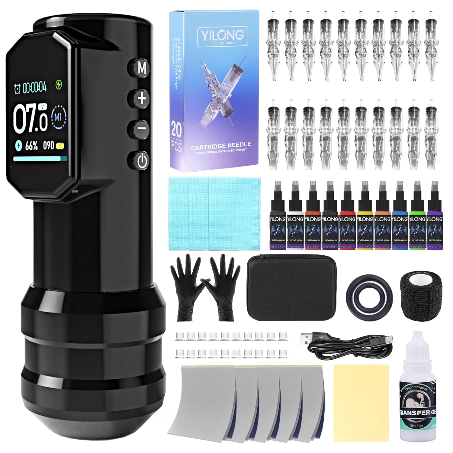 【Cordless Tattoo Kit Package】- The tattoo pen kit includes a battery-operated tattoo pen, 20 tattoo cartridge needles (1203RL*5, 1205RL*5, 1207RM*5, 1209RM*5), transfer gel, a TYPE-C charging cable, 20 ink caps, 1 practice skin, 5 transfer papers, 10 x 5ml tattoo ink bottles, 1 x 5.0CM self-cohesive tattoo grip cover, 1 pair of tattoo gloves, 2 rubber rings, and 3 tattoo table mats. This complete tattoo kit is an excellent choice for beginners, starters, and apprentices