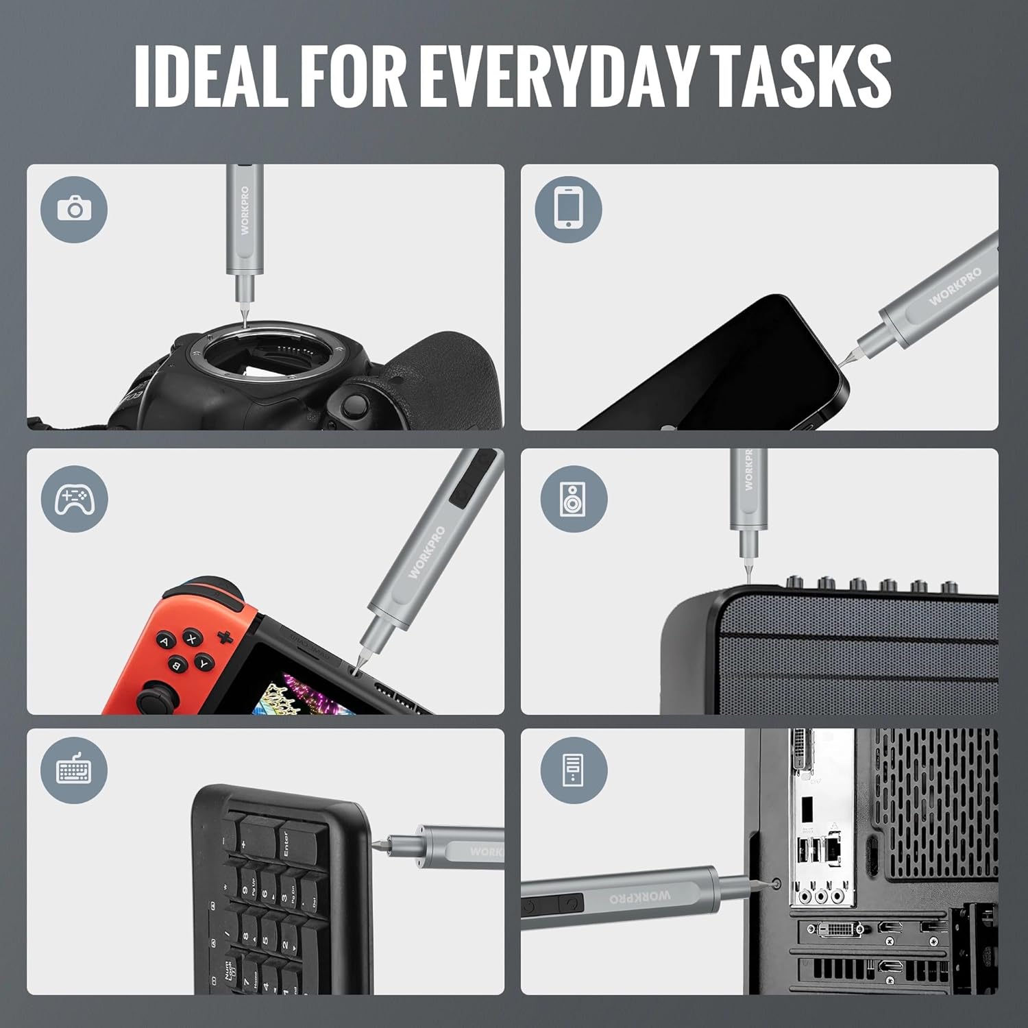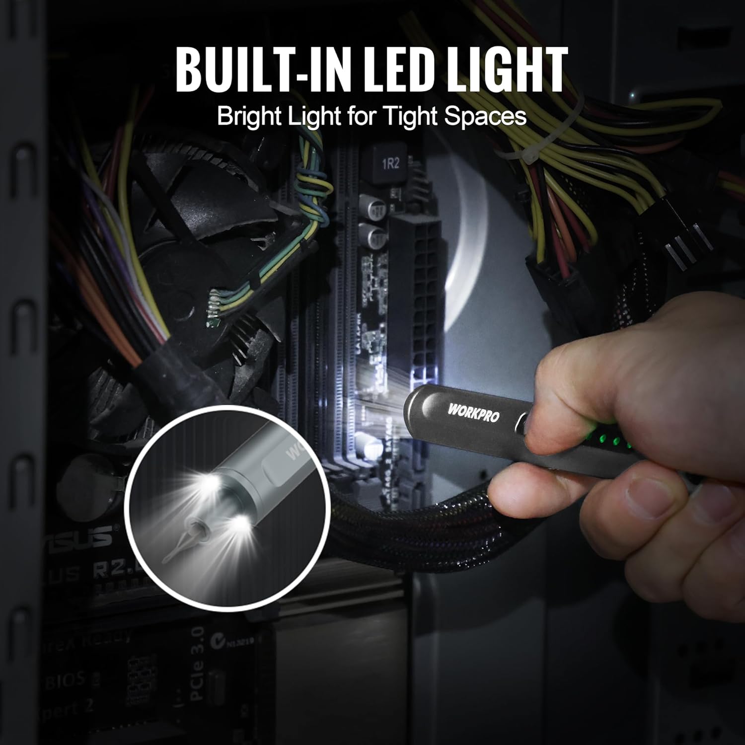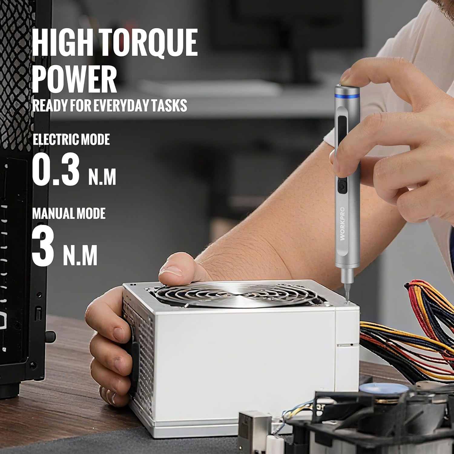 Powerful & Long-lasting: WORKPRO mini electric screwdriver comes with a strong motor delivering up to 175 RPM speed, max. 0.3 N·m torque in electric mode and max. 3 N·m torque in manual mode. Powered by a 3.7V 350mAh lithium-ion battery, the precision screwdriver can tighten up to 410 screws on a full charge, making electronic repair tasks a breeze