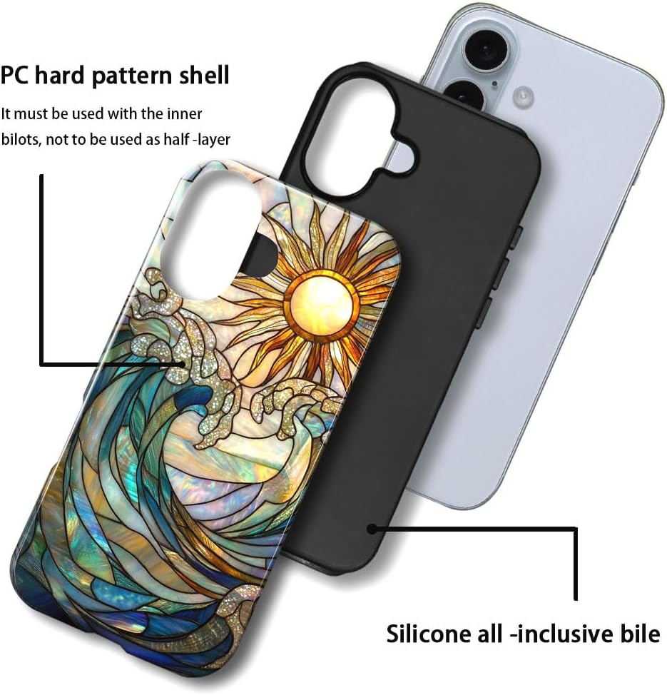 Case Compatible with iPhone 16,Glossy Hybrid 2-Layer Hard Shell,Shockproof Soft for Girl Women,Sea Wave Sun Stained Glass