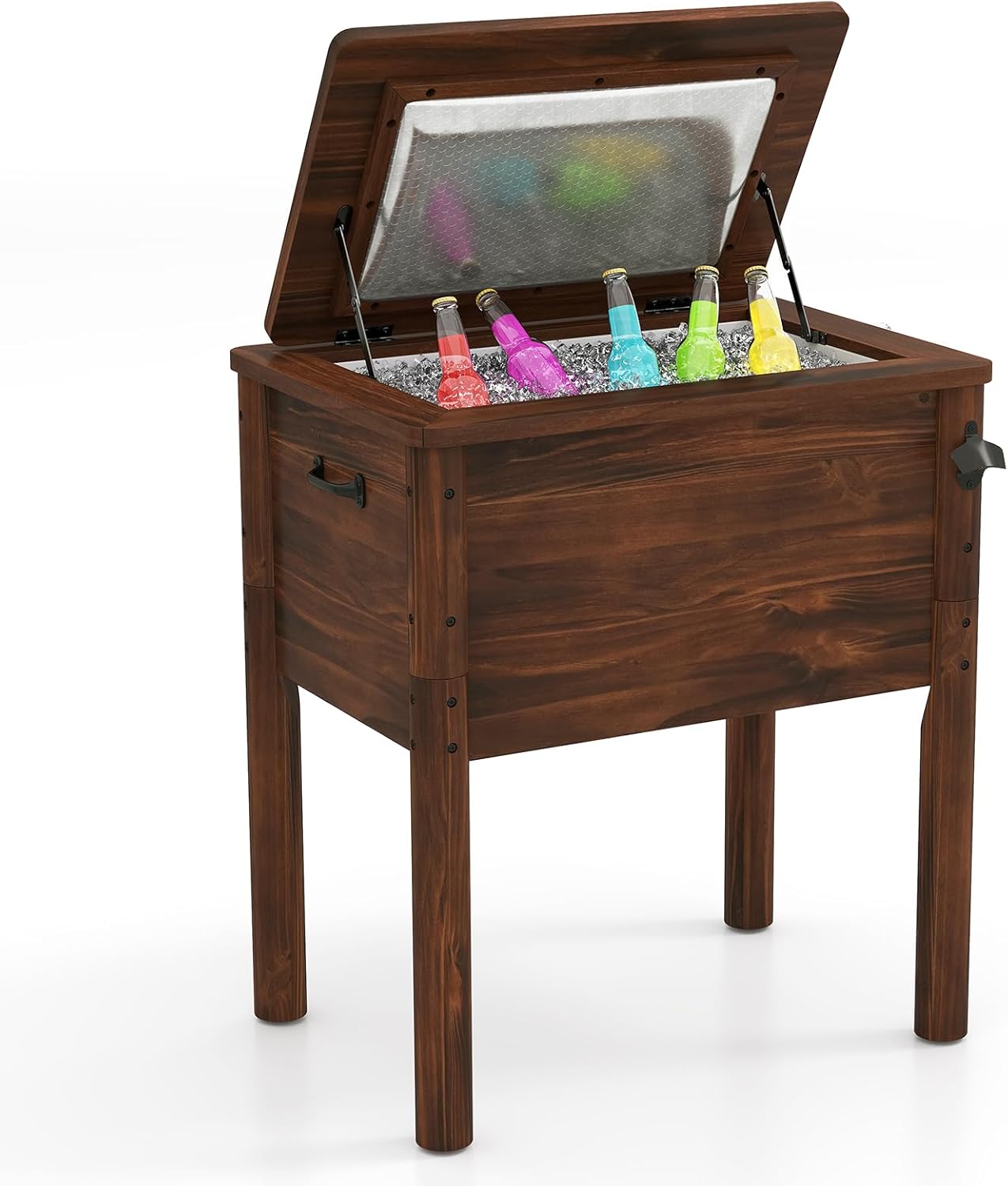Description:Elevate your outdoor gatherings with this wooden cooler. Engineered with exceptional insulation, this ice chest keeps drinks chilled or food warm for hours. The 54-quart capacity allows for storing up to 72 cans, perfect for parties. Crafted from solid pine wood with high-temperature treatment, it offers durability and weather resistance. Convenient features include a bottle opener, and side handles for portability. Recommended to fill the box with ice to 35% or more to achieve below effect.Features:54 quart large capacity for storing up to 72 cans (320 ml/can)Designed with 3-layer insulation structureMade of solid pine wood for stability and longevityWell-treated surface for weather resistanceEast to move around with side handlesEquipped with a lid handle and smooth hingesBottle opener provide maximum convenienceConvenient cleanup after use with a bottom drainage holeAssembly neededSpecifications:Color: BrownMaterial: Pine Wood, PP, EPSOverall Dimension: 26.5" x 18.5" x 29"(L x W x H)Internal Dimension: 21" x 13" x 12.5"(L x W x H)Capacity: 54 Quart/51 LHolding Time (Cool): 3-4 Hours (<86℉/30℃), 2-3 Hours (≥86℉/30℃)Holding Time (Warm): 3-4 Hours (>50℉/10℃), 2-3 Hours (≤50℉/10℃)Net Weight: 29.5 lbs1 x Wooden Patio Cooler1 x Instruction
