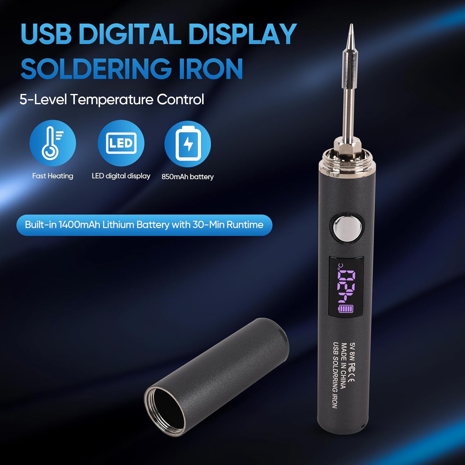 【PROFESSIONAL CORDLESS SOLDERING IRON KIT】1400mAh rechargeable battery with USB-C PD fast charging, compatible with power banks/laptops. Portable battery powered solder iron. Includes 3 premium tips, 1 aluminum alloy solder sucker, 1 lead-free solder wire & heat-resistant stand for electronics repair.