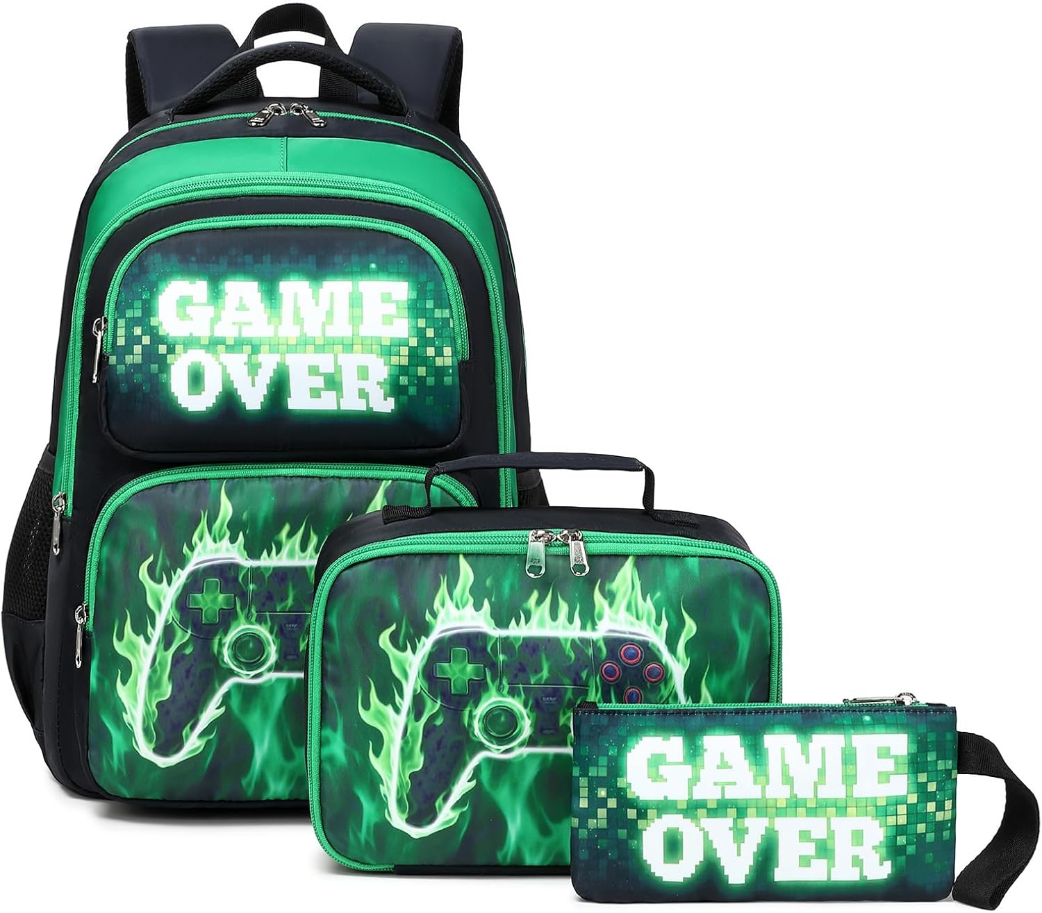 Octsky School Backpack for Boys, Kids Bookbag with Lunch Box, Flame Game Green