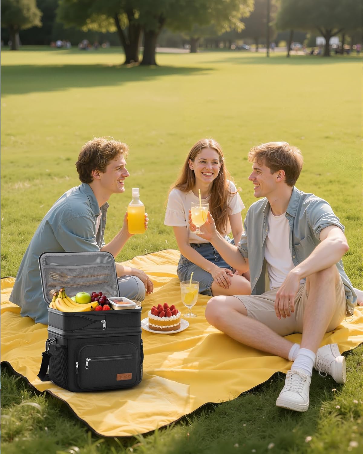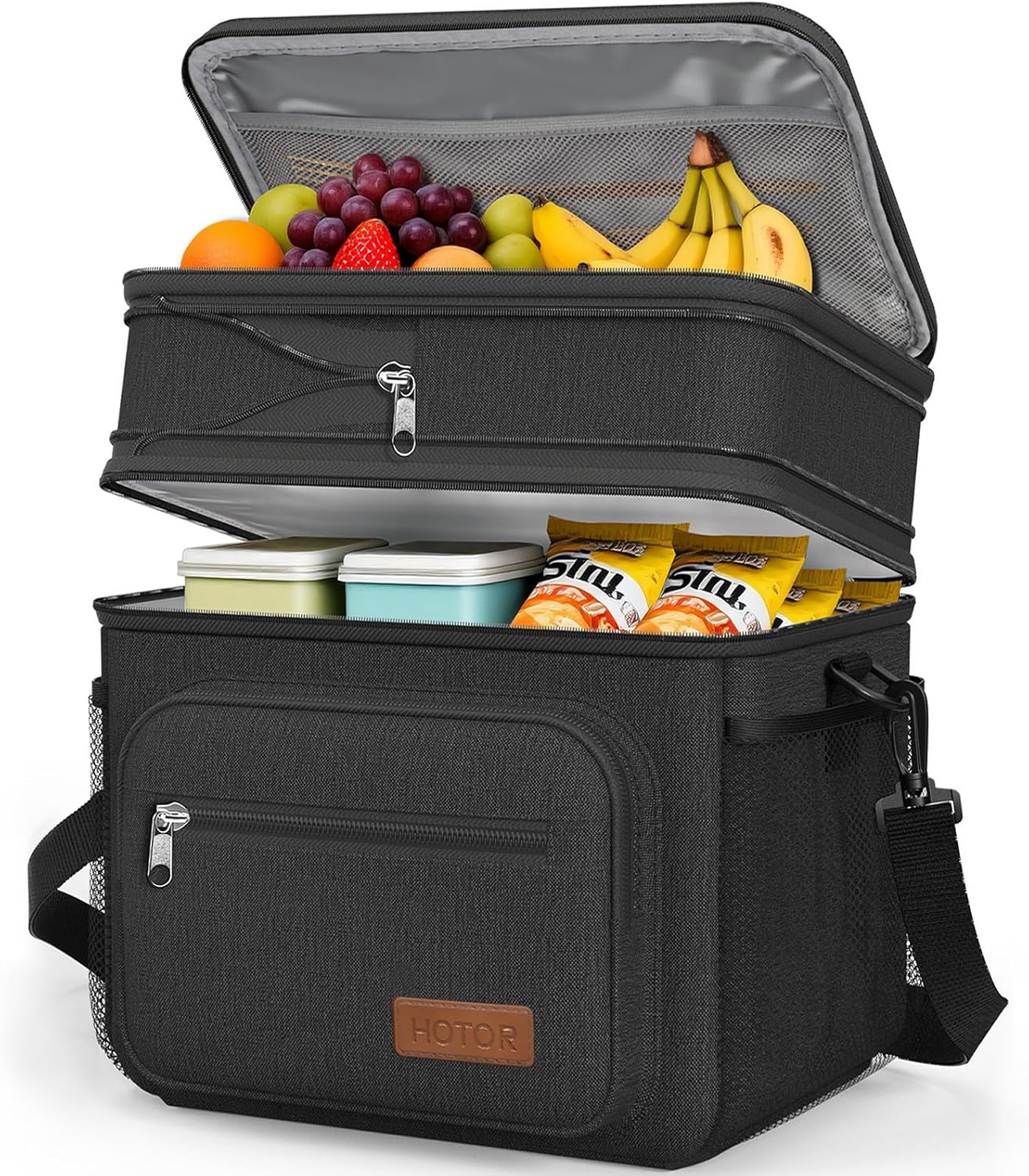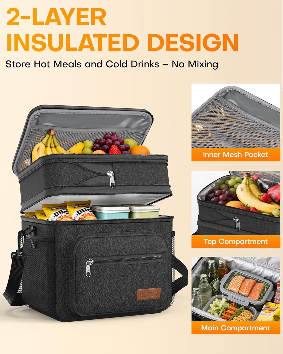 HOTOR Lunch Box for Men & Women - Double-Layer Insulated Lunch Bag with Leakproof Liner, Portable Cooler for Work, Travel, or Picnic, Black, 12L, 11.1" x 9.7" x 6.7"