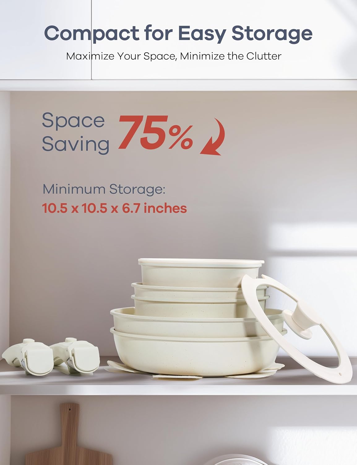 75% Space-Saving: Perfect for small kitchens, Ganiza stackable pots and pans set saves up to 75% storage space, with minimum storage just 10.5 x 10.5 x 6.7 inches. Detachable handles let you nest pans neatly for a clutter-free kitchen.