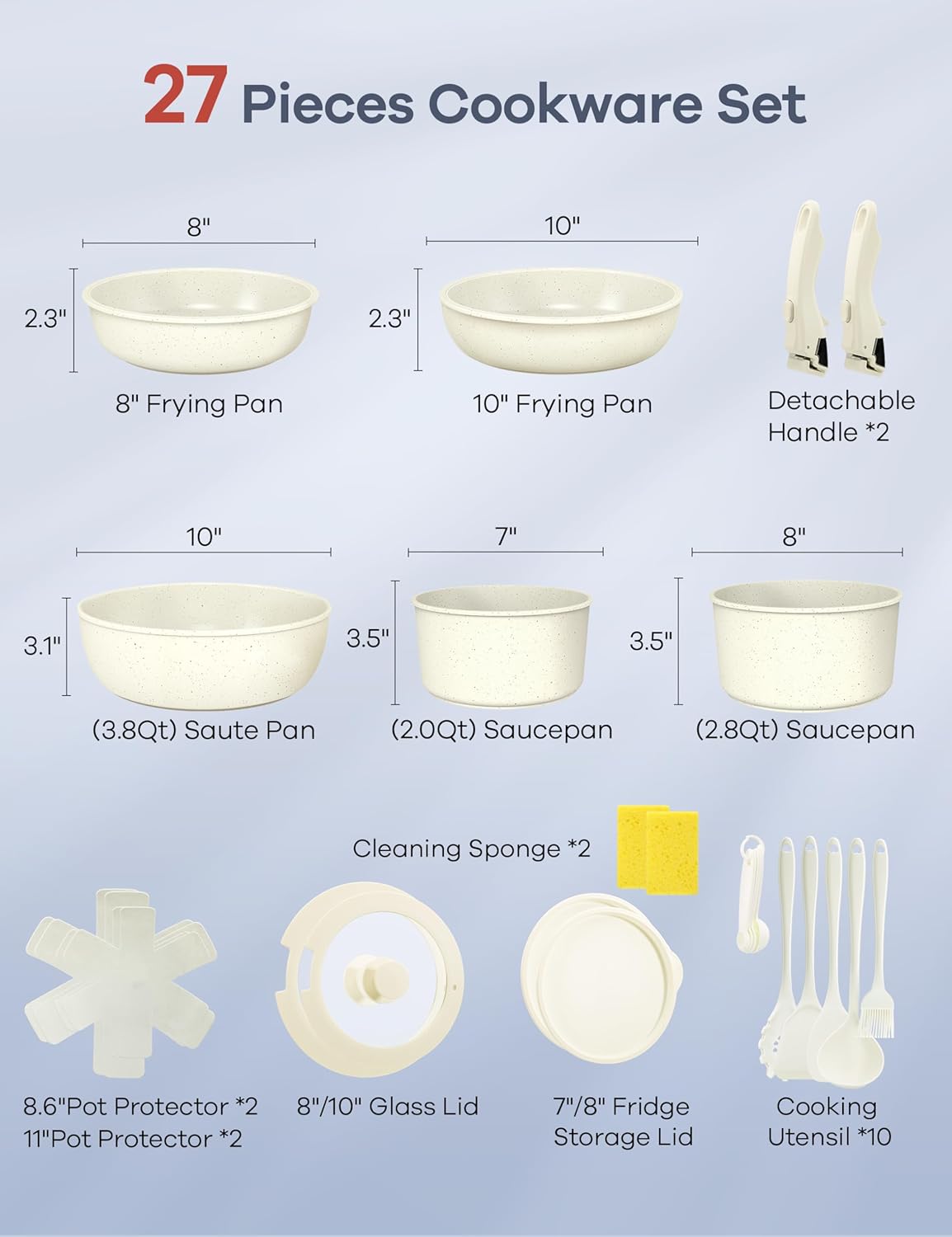 Ganiza 27pcs Nonstick Cookware Set, Pots and Pans Set Non Stick Detachable Handle, Non Toxic Cookware Sets Induction, Pots and Pans with Removable Handles, RV Cooking Set, Oven/Dishwasher Safe