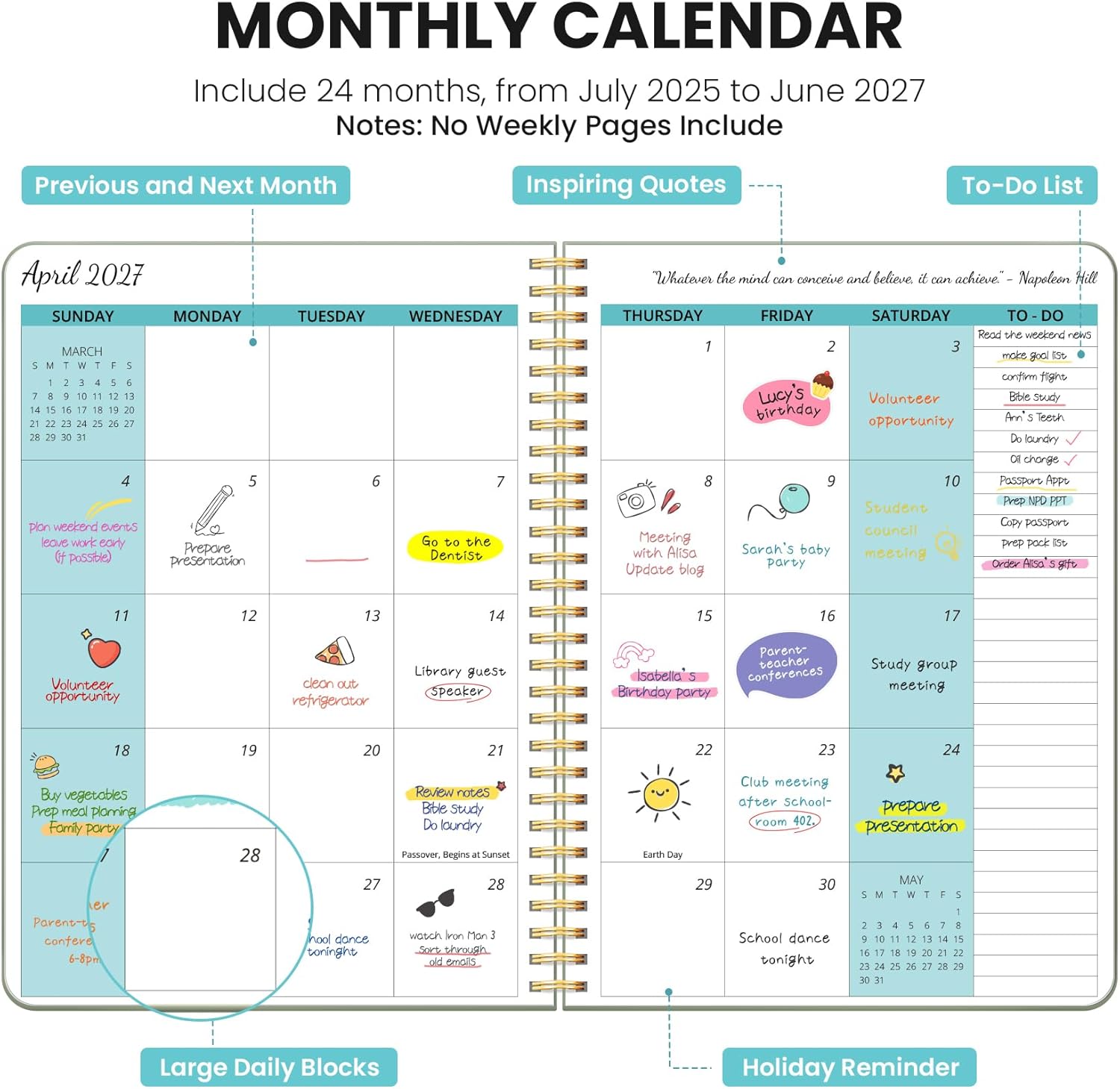 Practical Features: This monthly planner includes a transparent double-sided pocket to store notes, receipts, and other small essentials. The twin-wire spiral binding ensures it stays flat for easy writing, while motivational quotes inspire a positive outlook and personal growth, making it a highly functional and uplifting tool for daily use.
