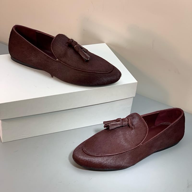 2025 Summer Loafers Retro Horsehair Tassel Shoes Women Minimalist Women's Shoes Retro Genuine Leather Flat Shoes