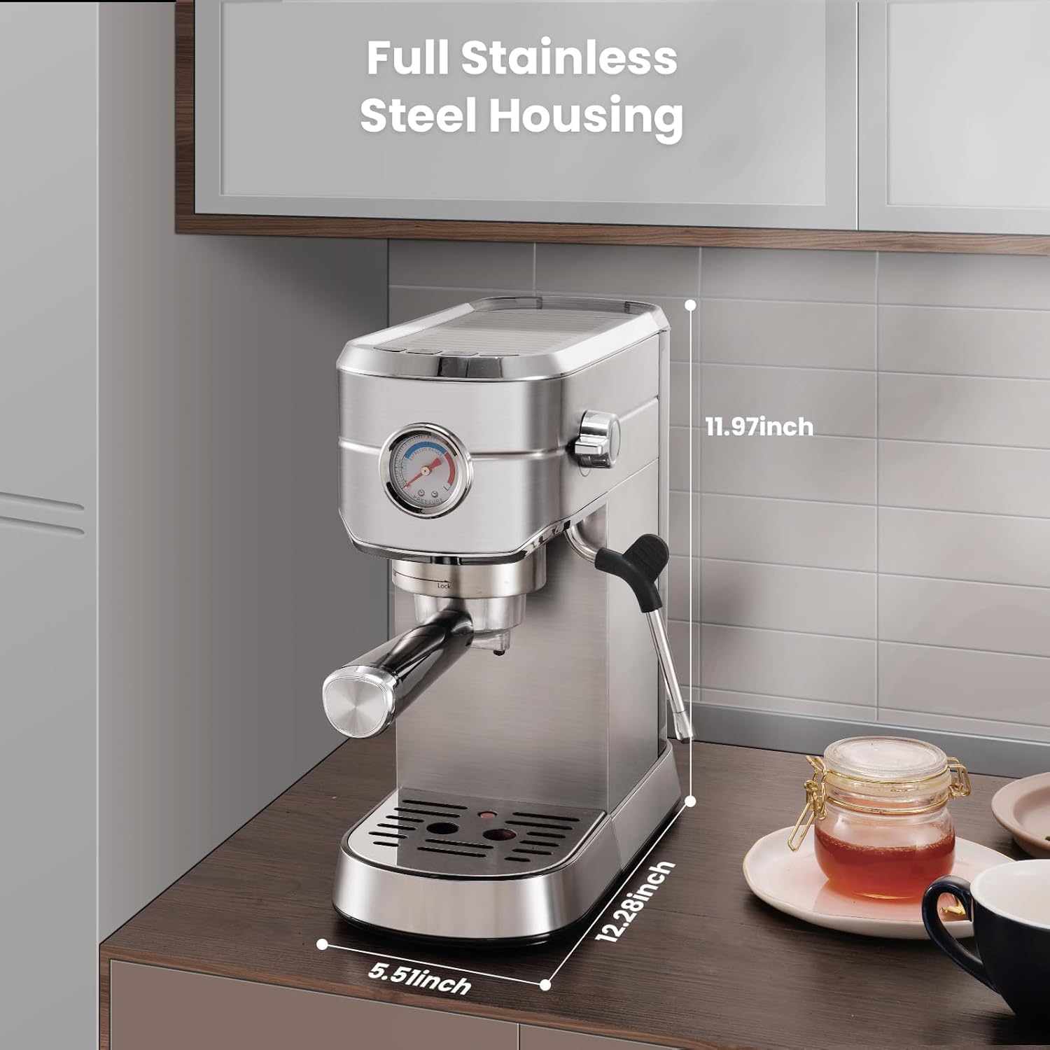 𝐂ompact & 𝐃urable - This cappuccino machine features a full stainless steel housing that is both stylish and durable, with a modern aesthetic that complements a variety of kitchen decors. Furthermore, its compact design makes it perfectly suited for countertops and kitchens of any size.