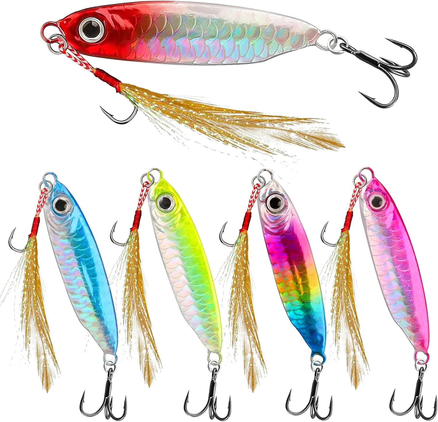 One box including 5pcs of 30g/1.05oz fishing spoons in 5 different colors, suitable for Light Jigging for Fishing such as Bass, Trout, Crappie, Pike, Walleye, Tuna, Blue Fin, Cod, Bonito, Snappers, Groupers and Other Saltwater Fish Species.