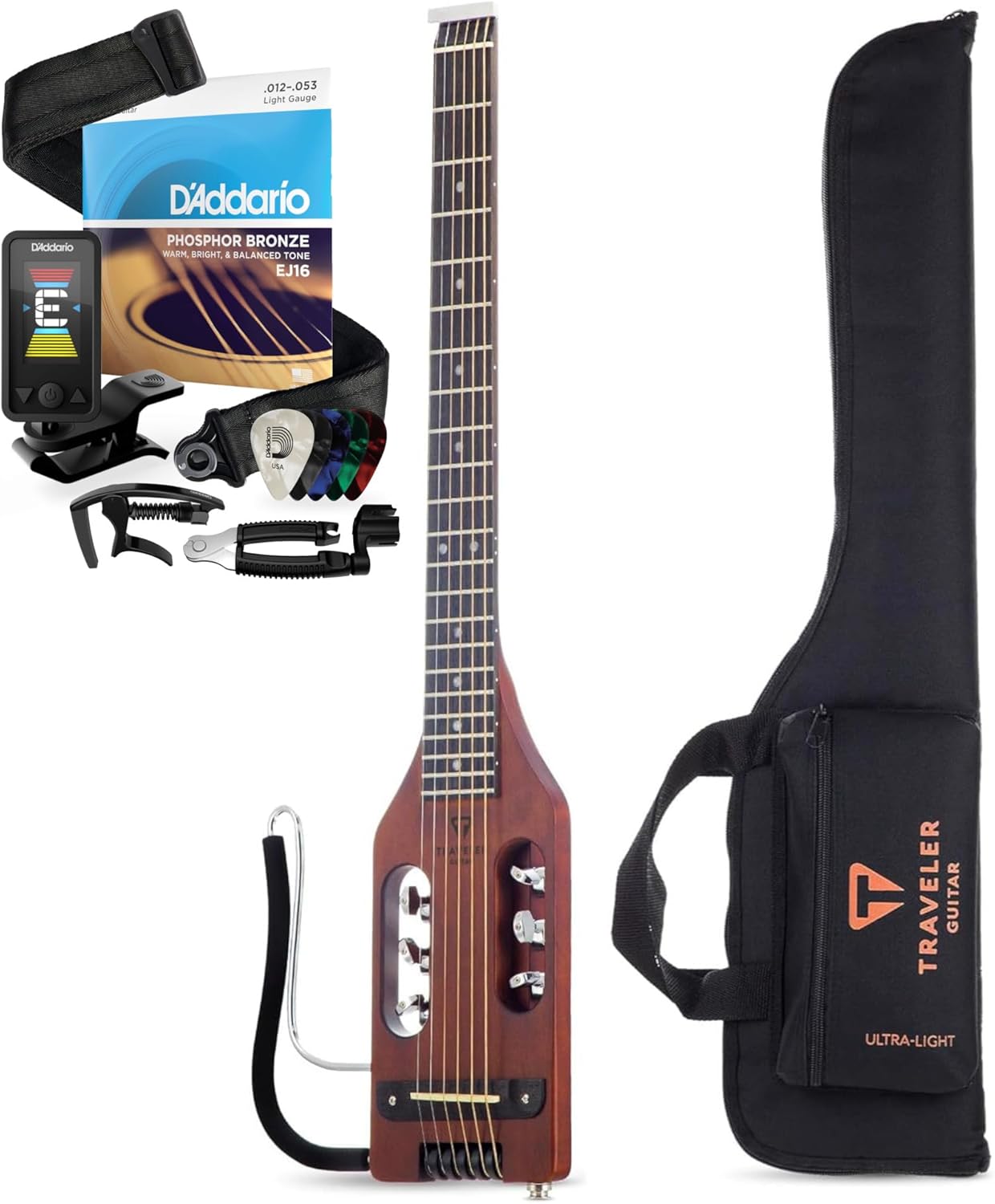 THIS BUNDLE CONTAINS: 1 Traveler Guitar Ultra-Light Acoustic Guitar | Small Acoustic-Electric Guitar with Removable Lap Rest | Full 24 3/4" Scale Headless Guitar | Portable Travel Guitar | Custom Gig Bag Included + 1 D’Addario Phosphor Bronze Acoustic Guitar Strings | Rich, Warm & Balanced Tone | Precision Wound for Long Life | Made in the USA | 12-53 Light + 1 D'Addario Accessory Set: Eclipse tuner, Pro-Winder, Tri-Action capo, 50mm Auto Lock Strap, 10-pack of medium celluloid picks.