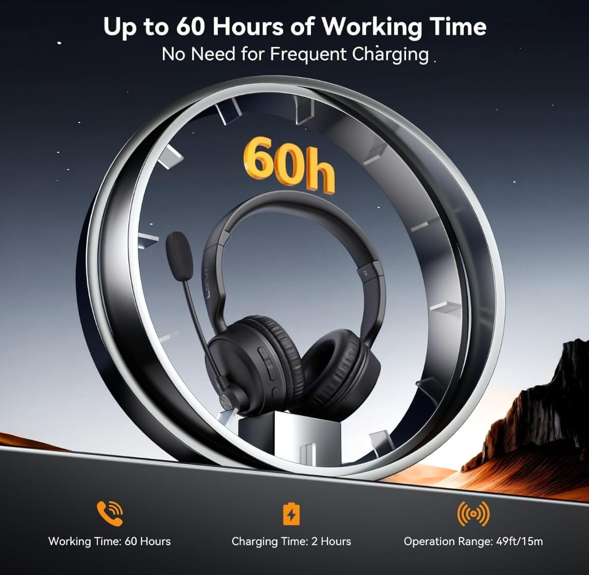 60 Hours Working Time & HiFi Stereo Sound:Say goodbye to the hassle of frequent charging. This wireless headset with mic for work fully charges in just 2 hours and boasts an impressive 60 hours of battery life. It provides 8 hours of talk time per day, allowing you to work without the risk of power outages during business trips or busy meetings. These Bluetooth headphones with microphone deliver clear stereo sound, allowing you to enjoy music in the highest wireless Bluetooth quality