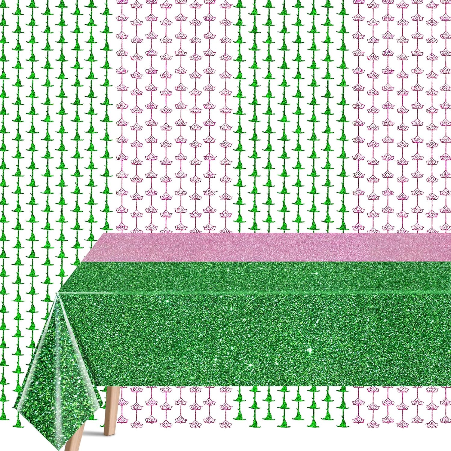 Witch Hat Crown Curtain Magic Bad Witch Theme Party Decoration,3.3 x 6.6ft Tinsel Foil Curtain Backdrop, Pink and Green Waterproof Tablecloth for Halloween, Wicked Party Decorations, 3Pcs