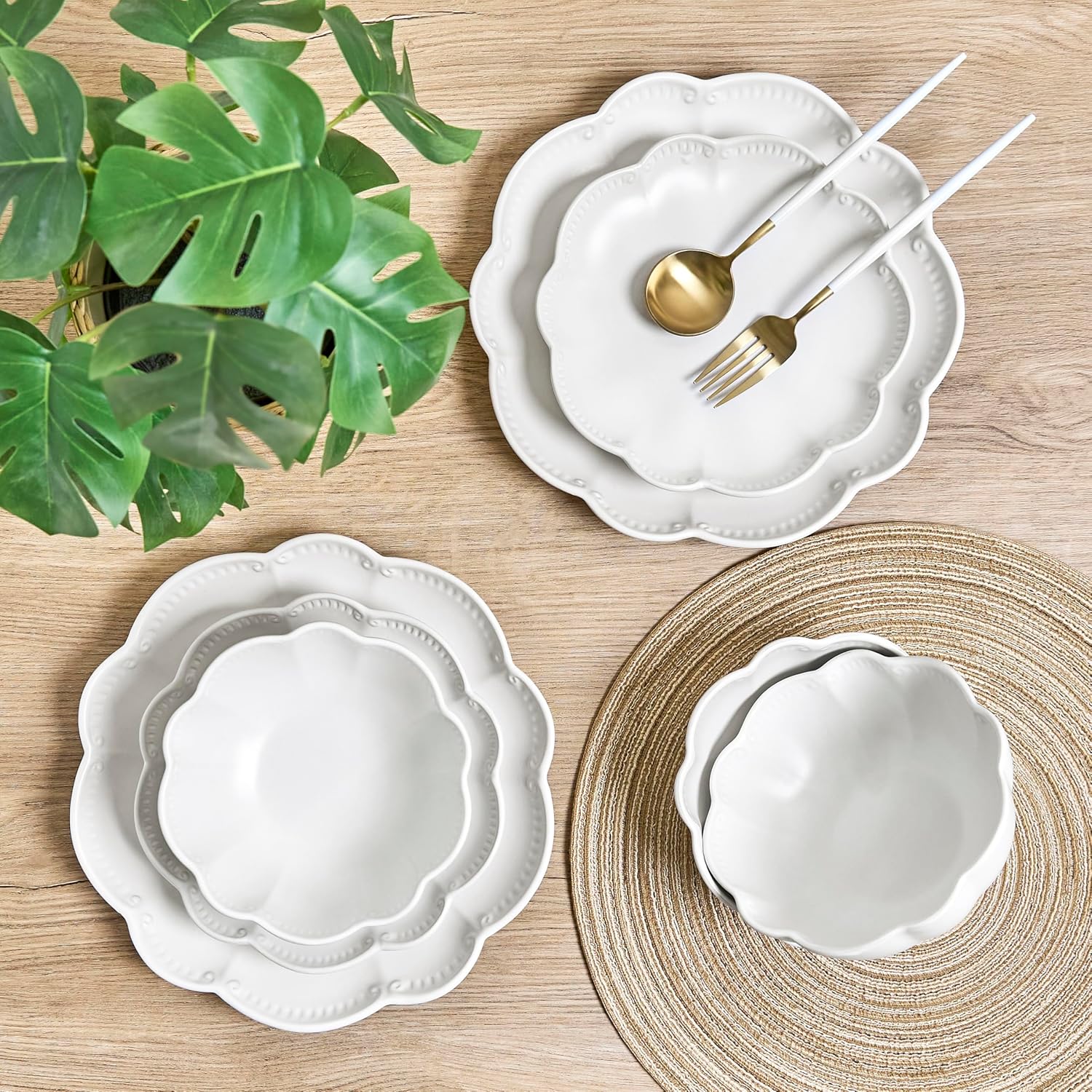 【STRONGER BUILD & FAMILY-SAFE】: Made from premium LEAD-FREE, CADMIUM-FREE, NON-TOXIC stoneware, this set is durable, chip-resistant, and safe for everyday dining. The bright white scalloped french country inspired design adds timeless beauty while ensuring a smooth, easy-to-clean surface that maintains its elegance over time.