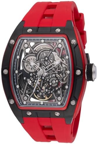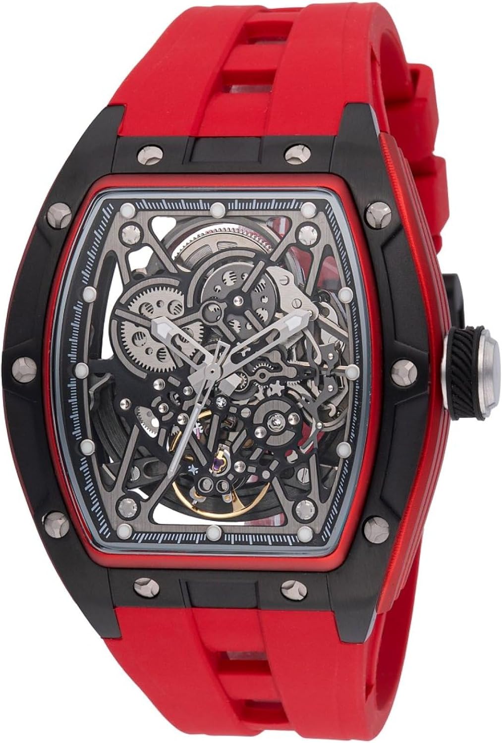 Black dial enhanced by silver-tone hands. Silver-tone and Black stainless steel case with a red silicone band. Automatic movement. 30 meters / 100 feet water resistance. Fixed bezel. Flame Fusion crystal. Transparent See Through caseback. Buckle clasp. Screw Down crown. Case size 44 mm x 14.7 mm. Band 26 mm x 9.75 incheslong. Invicta 49017 S1 Rally Watch.