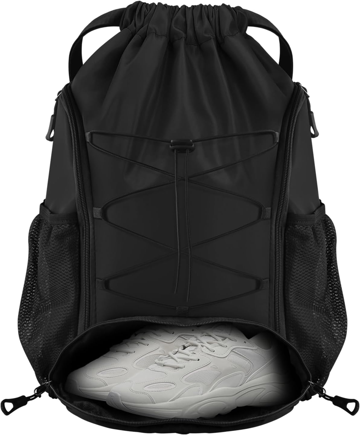 Multi-compartment Design: This waterproof drawstring backpack has mesh pockets on both sides for umbrella, water bottle. There is also a zippered pocket on the side for storing key keys, wallet, cell phone or small valuables etc. Size: 12.6“x4.75”x18.5", with a capacity of 30L, enough for storing your daily essentials